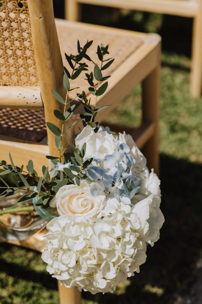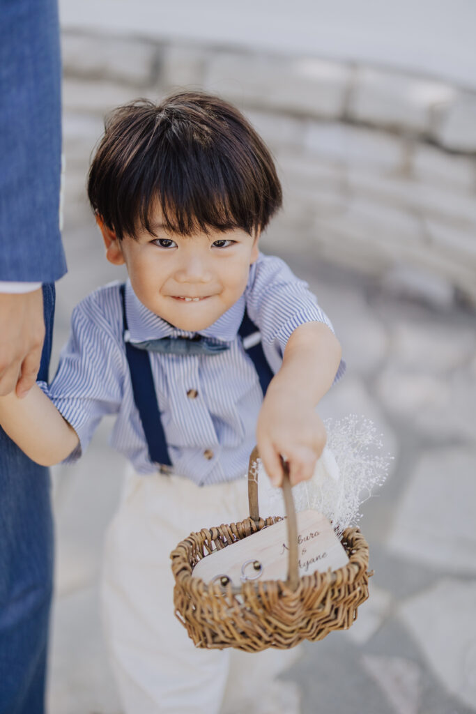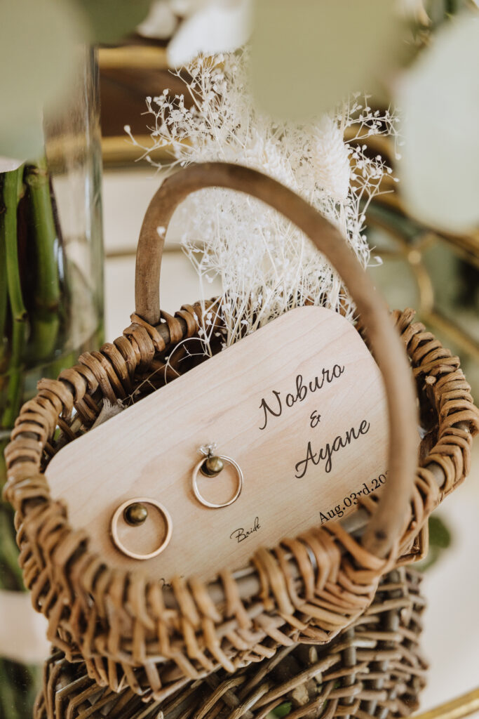 The couple’s wedding rings rested in a woven basket, a timeless symbol of love at this coastal wedding venue.