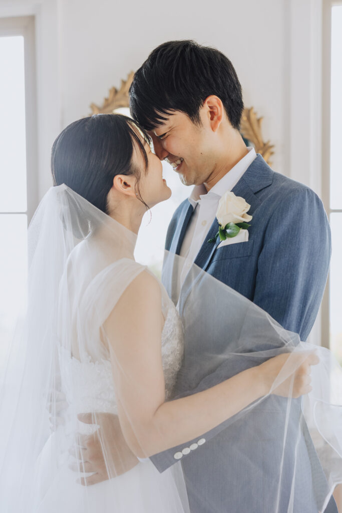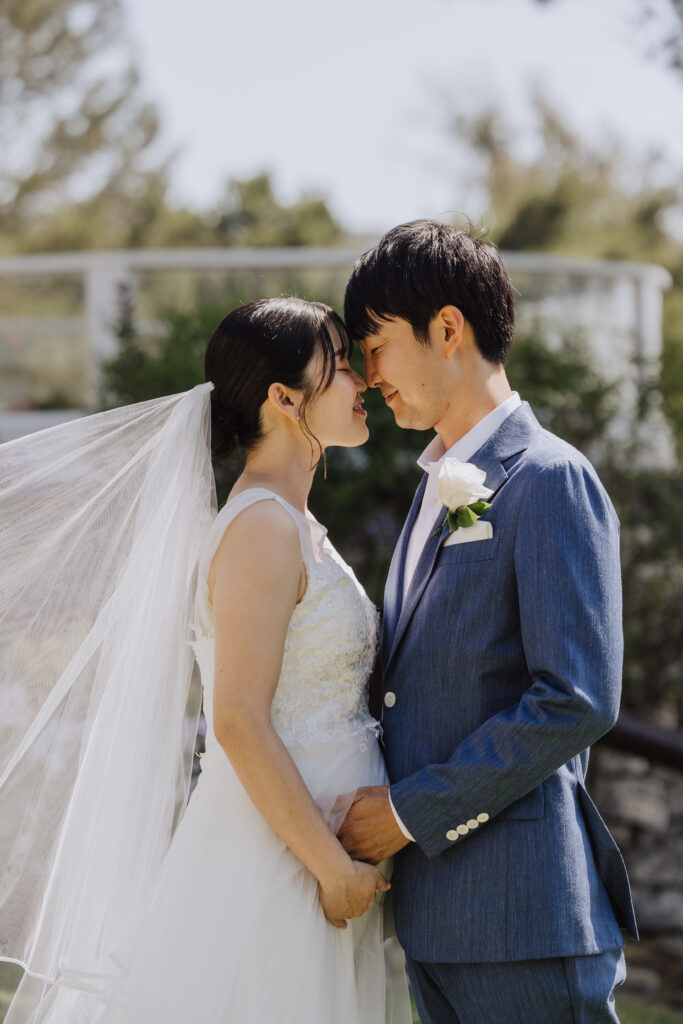 Wrapped in her veil, the bride kissed her groom one last time before family and friends witnessed their romantic coastal wedding.