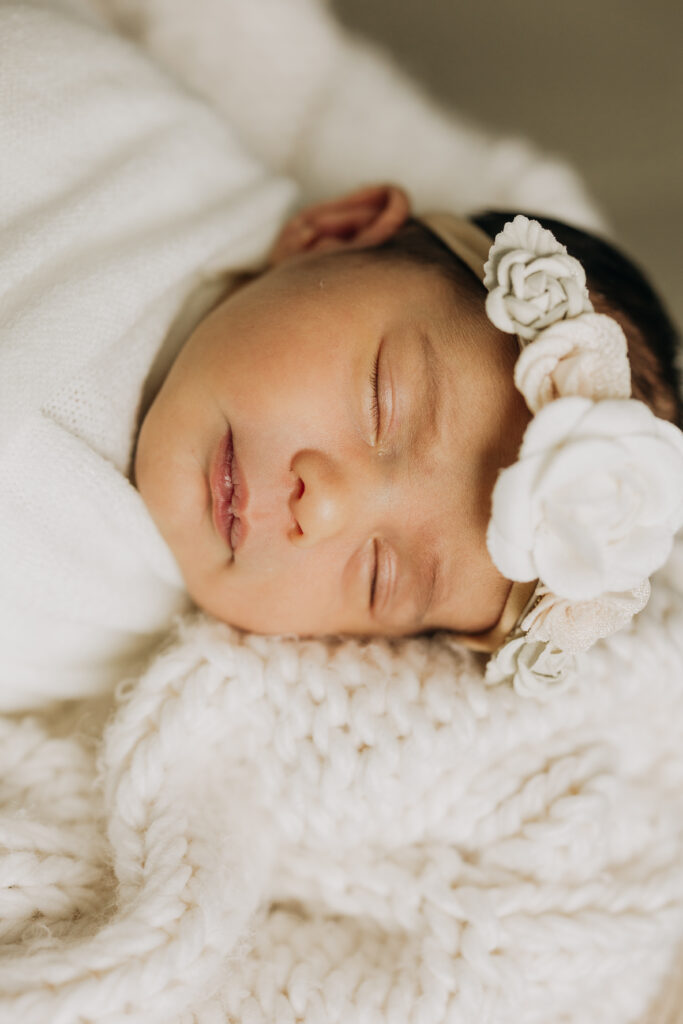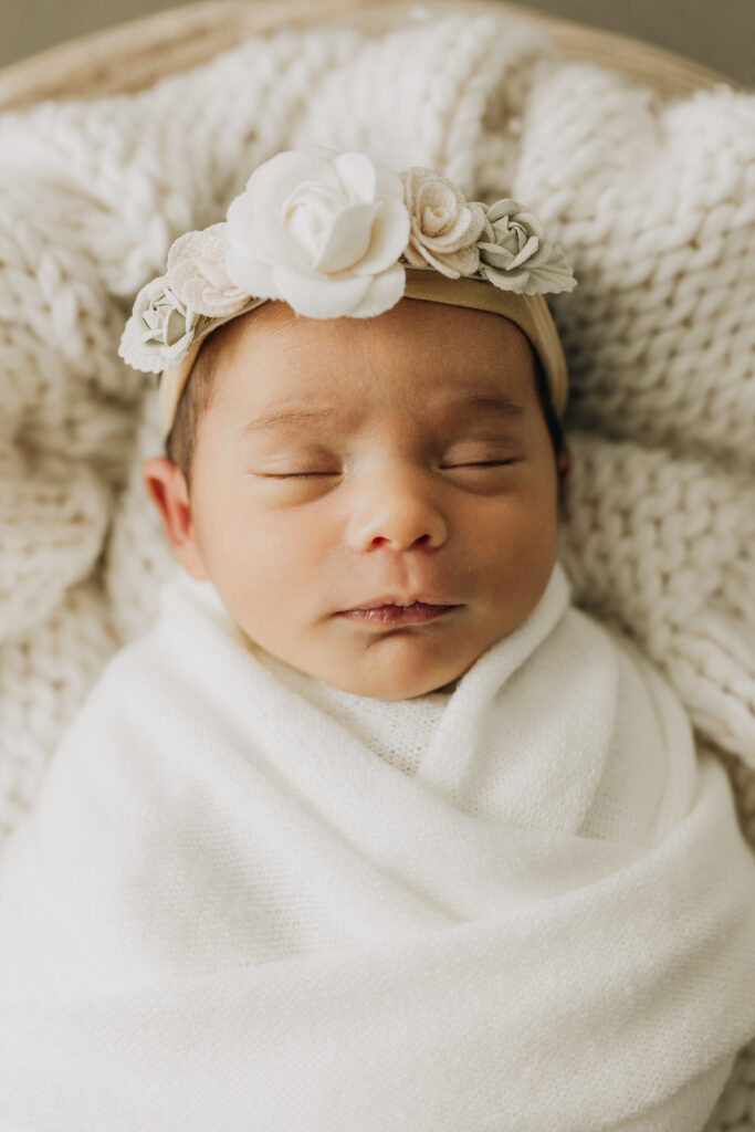 Close-up of the swaddled newborn with a delicate flower crown, her eyes peacefully close.