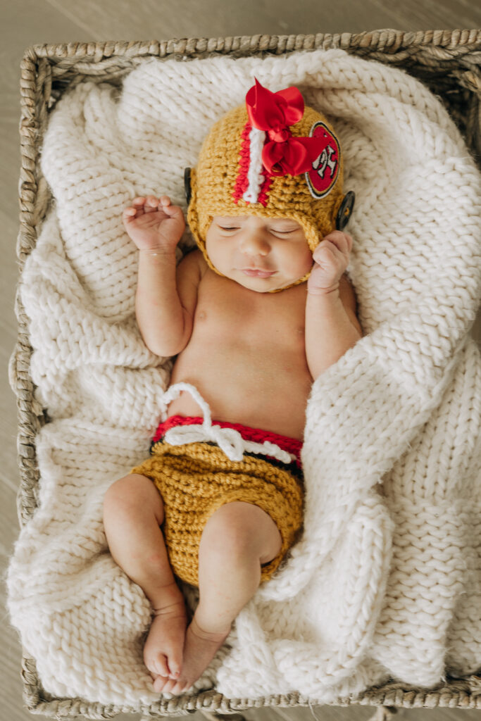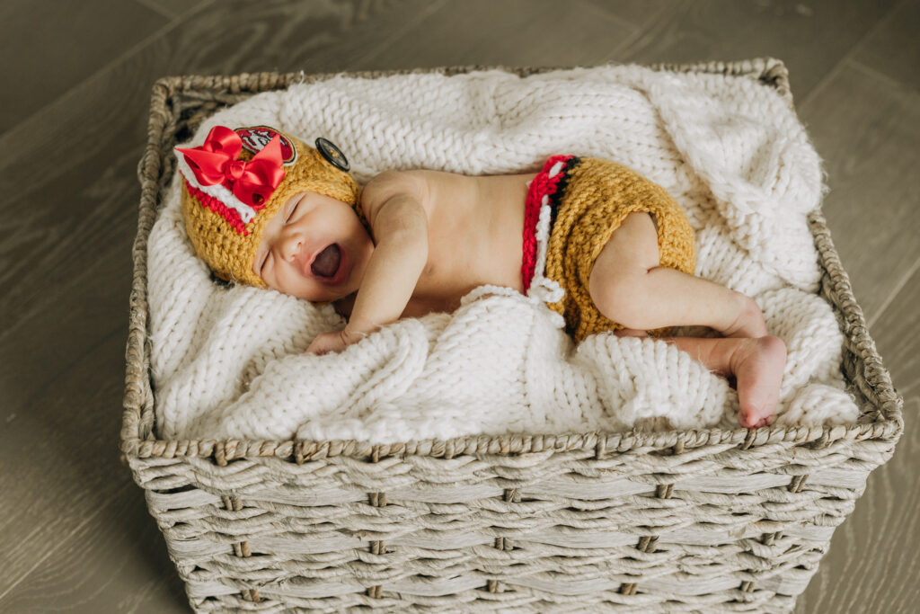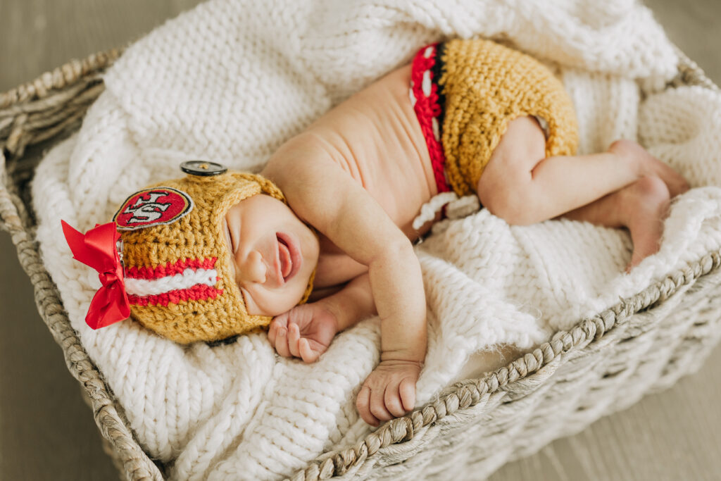 The tiniest 49ers fan yawns in her basket, creating a playful and memorable South Bay newborn photoshoot moment.