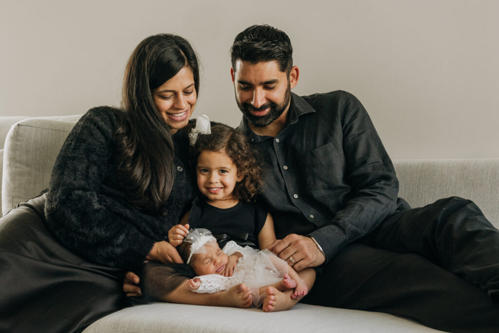 The parents and big sister gaze lovingly at their newborn. It’s a perfect photo idea for South Bay family and newborn photos at home.