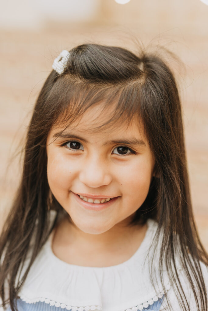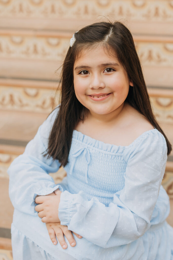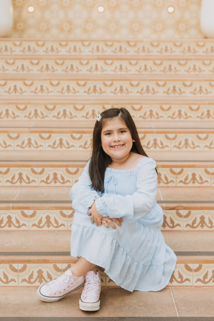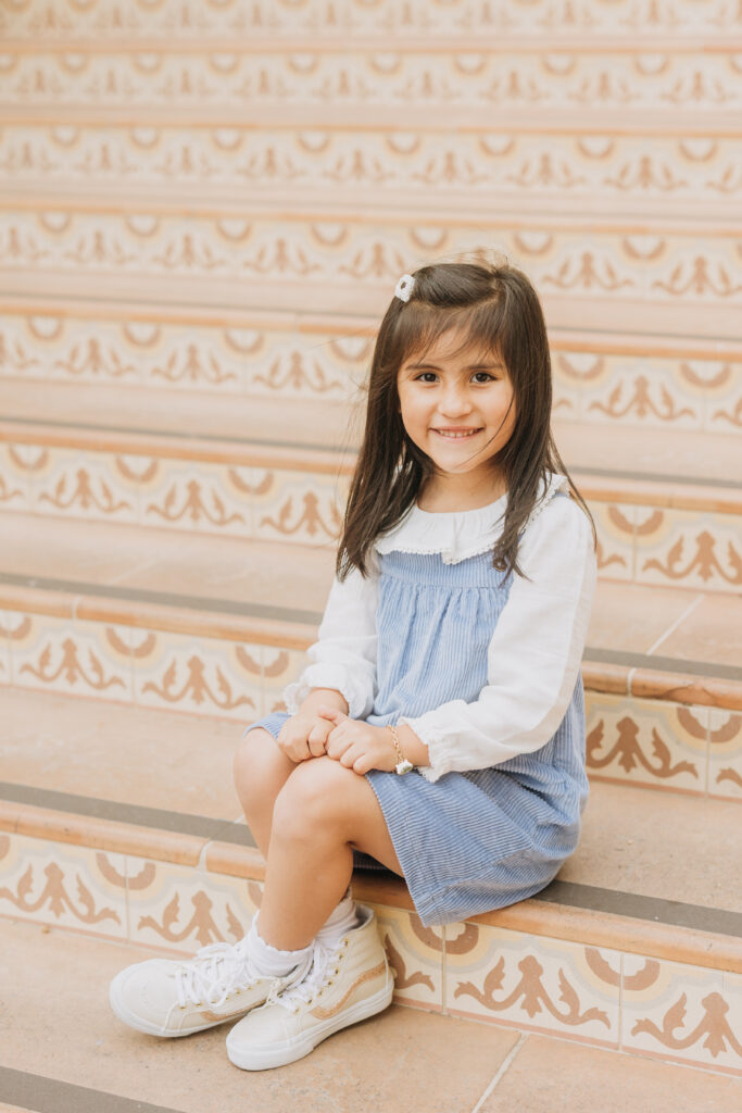 Wearing a soft blue dress and a delicate barrette, the eldest daughter’s portraits captured a quiet, timeless moment at Terranea Resort.