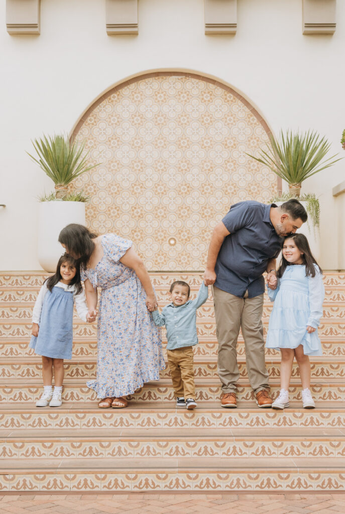 Hand in hand, the parents shared a kiss before showering their children with forehead kisses while strolling down the sunlit steps, a true family moment.