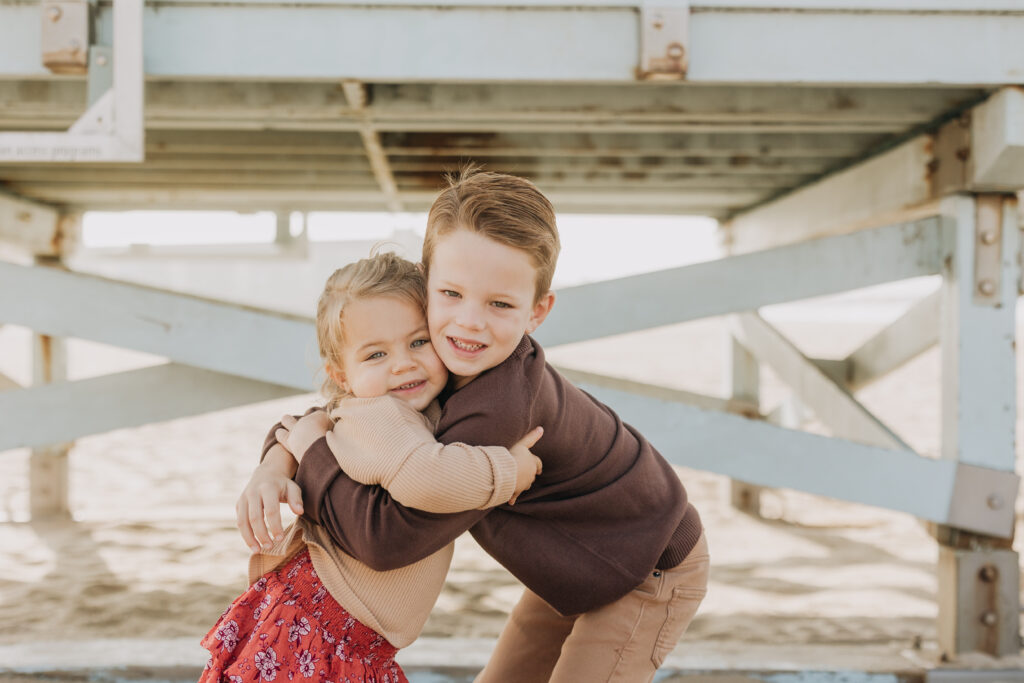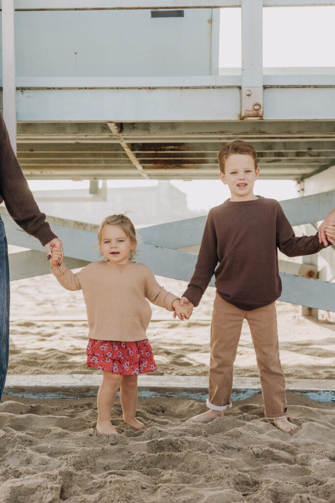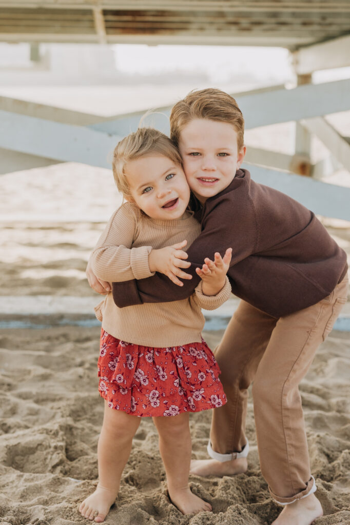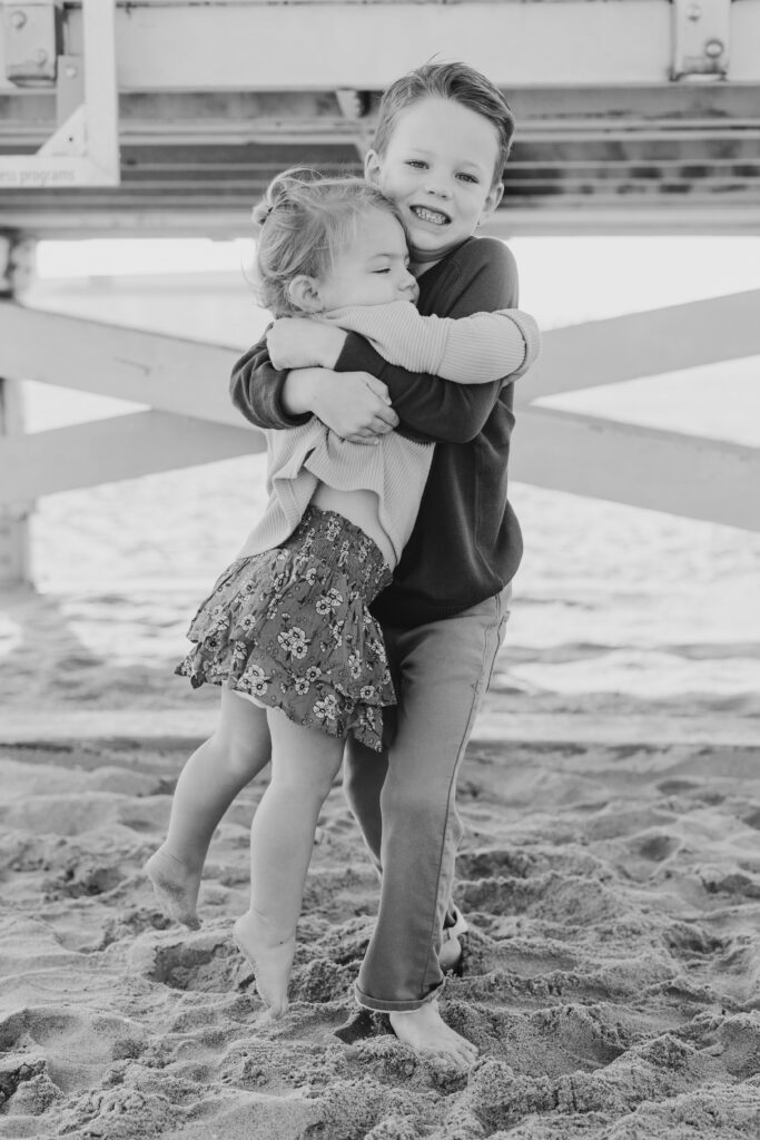 Hand in hand beneath the lifeguard tower, the siblings walked together until big brother scooped his little sister up in a sweet moment.