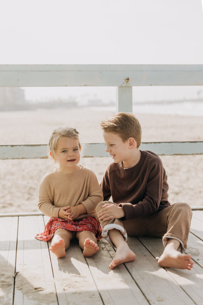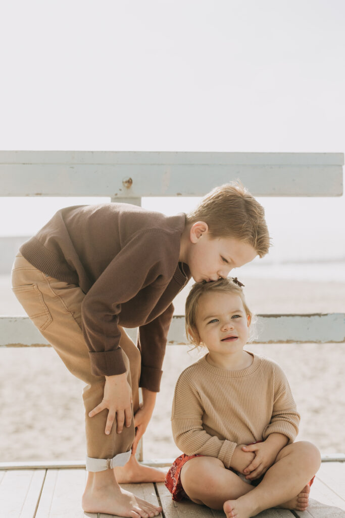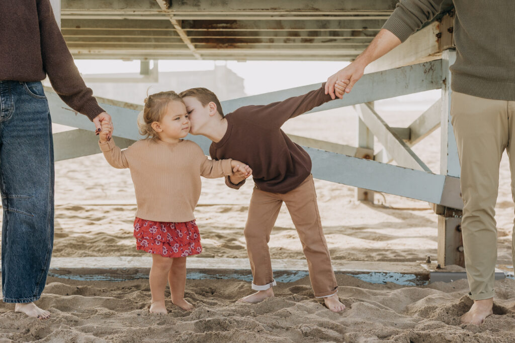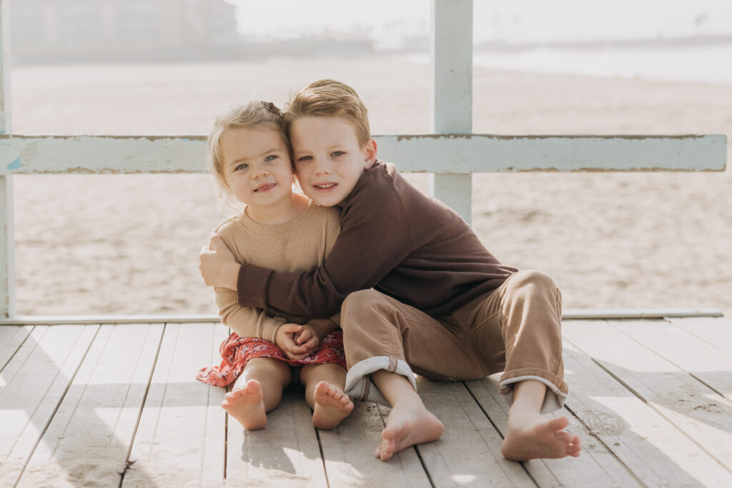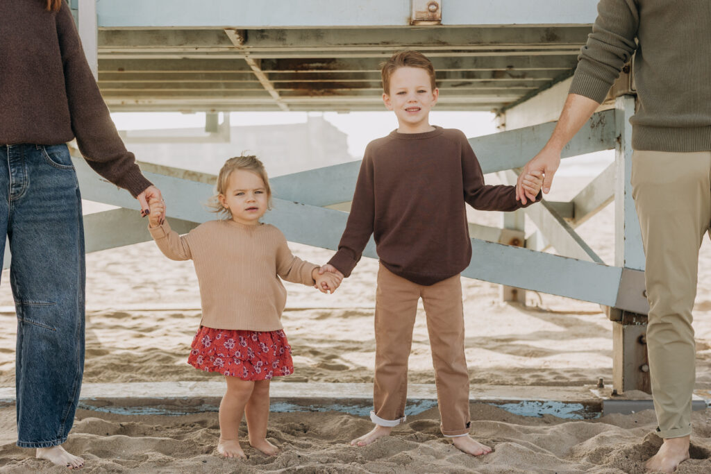 Hand in hand beneath the lifeguard tower, the siblings walked together until big brother scooped his little sister up in a sweet moment.