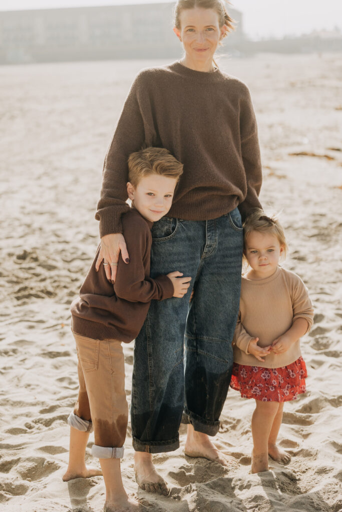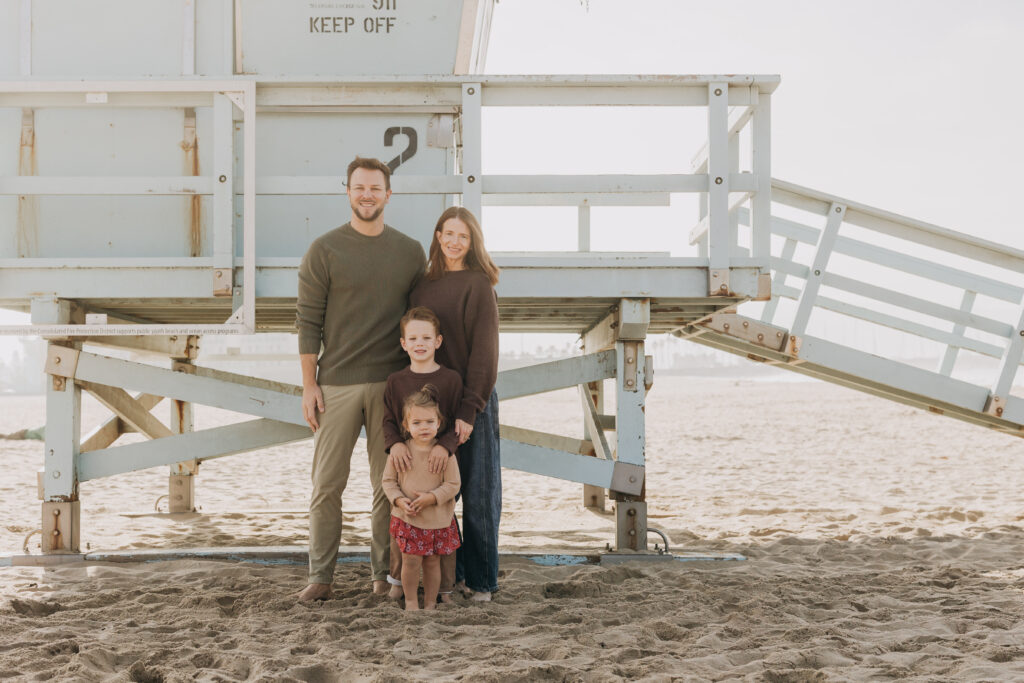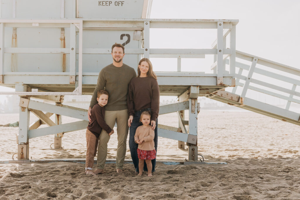 Bathed in golden light, the family paused together for a glowing Southern California beach family portrait.
