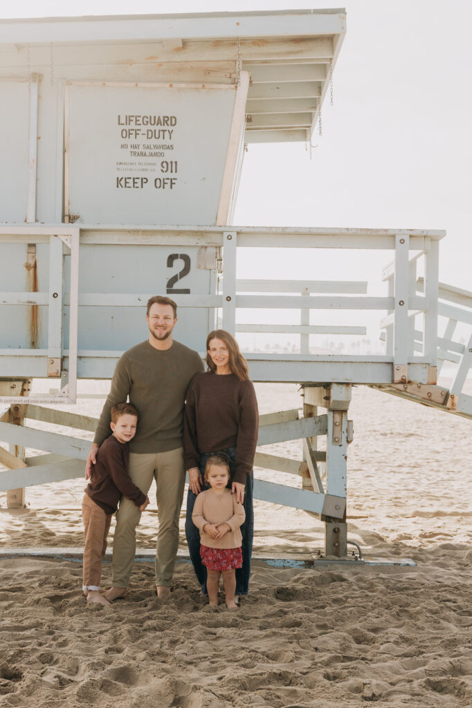 The whole family gathered in front of the lifeguard tower, a timeless backdrop for Hermosa Beach family photography.