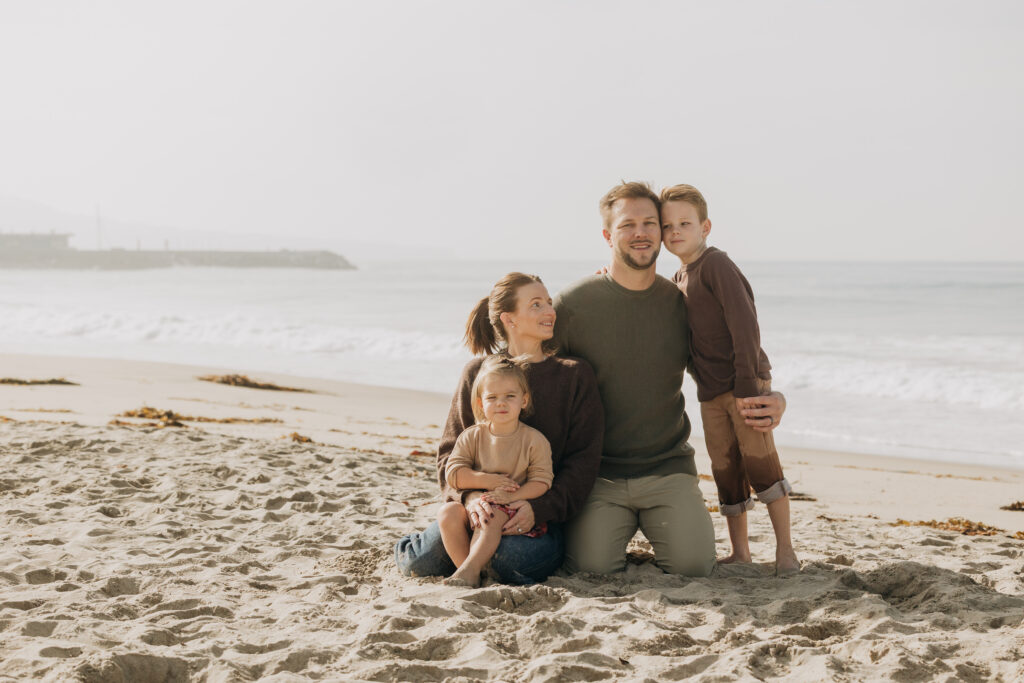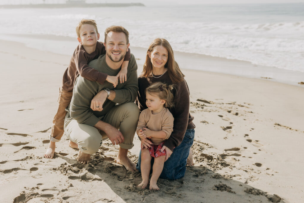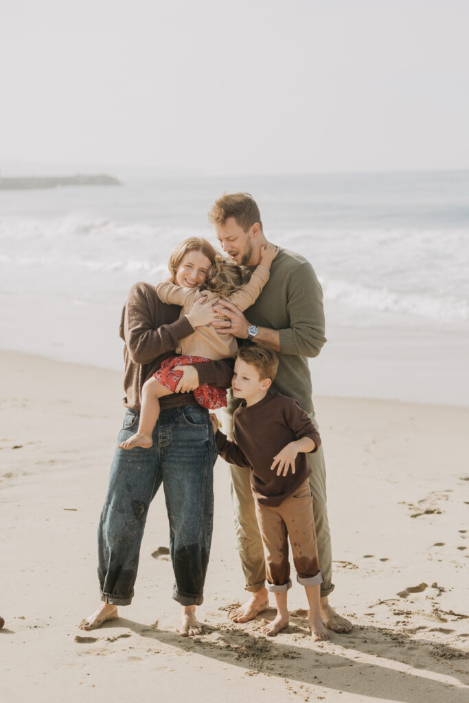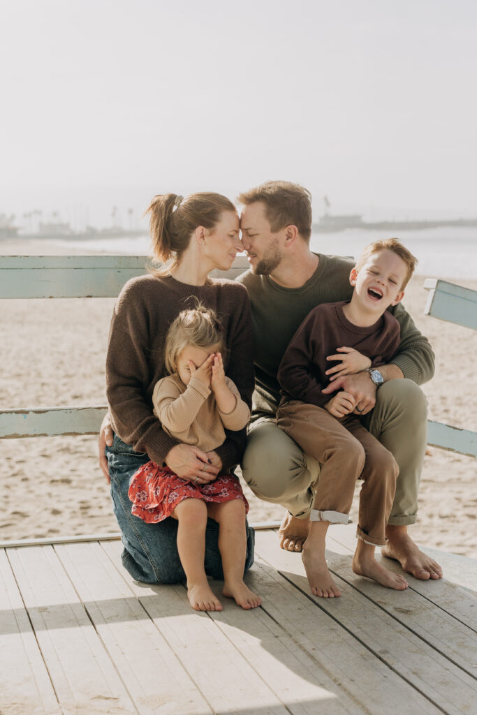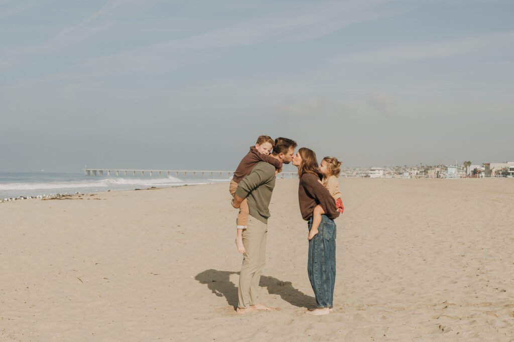 A dreamy beach family session unfolded in Hermosa Beach as mom and dad leaned their heads together, holding their children close along the Southern California shoreline.