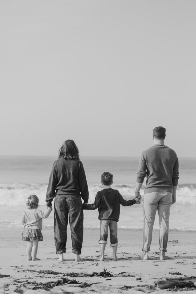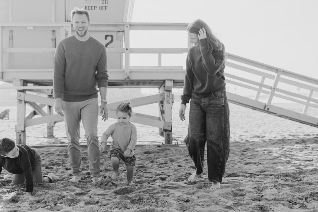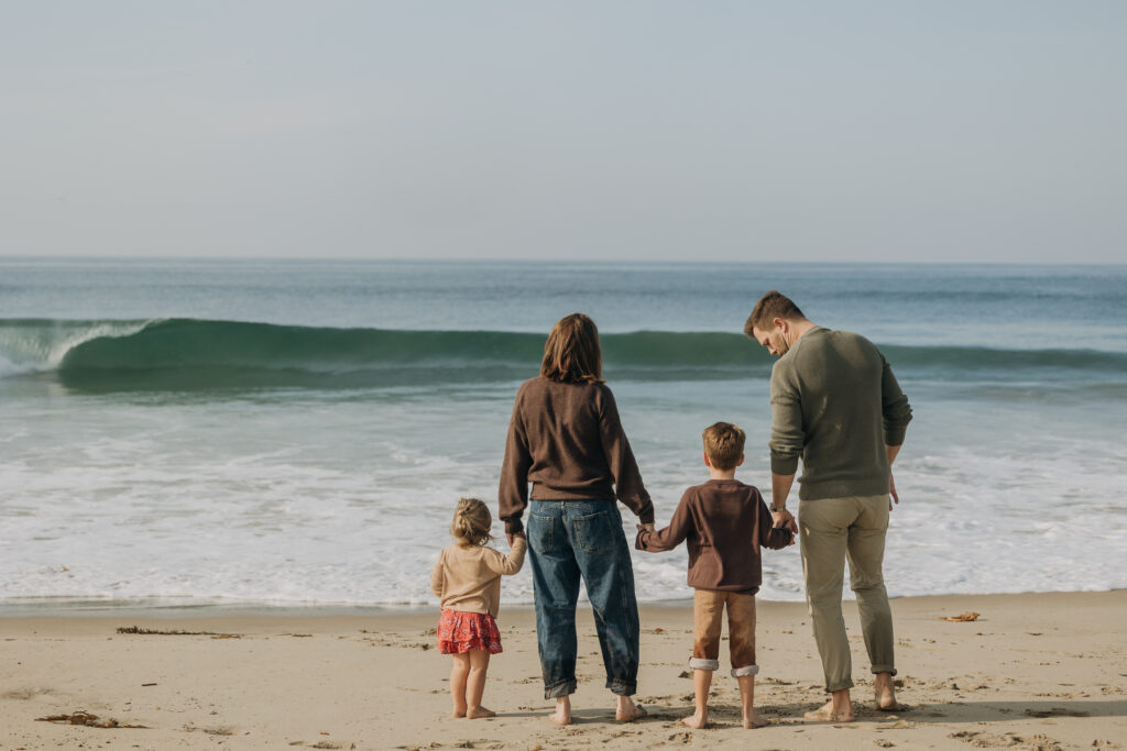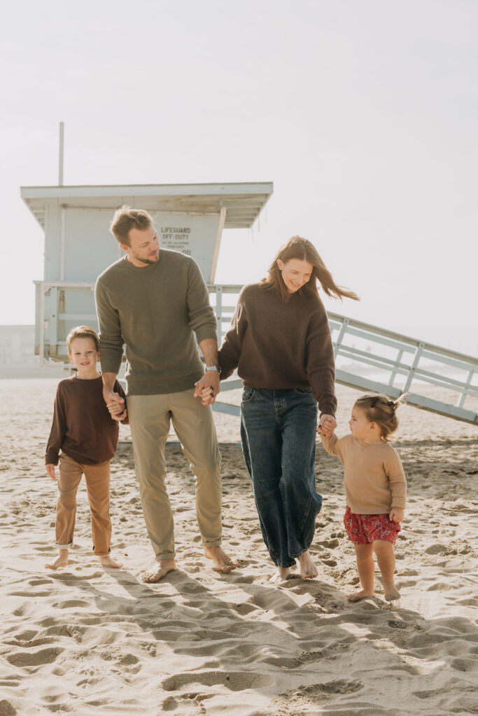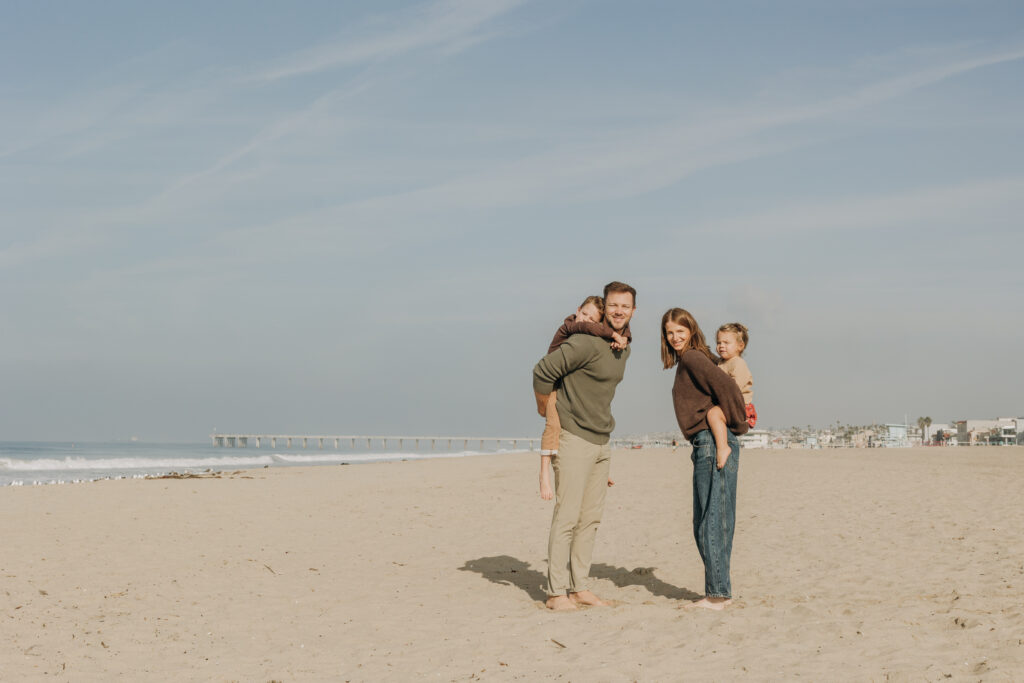 A dreamy beach family session unfolded in Hermosa Beach as mom and dad leaned their heads together, holding their children close along the Southern California shoreline.