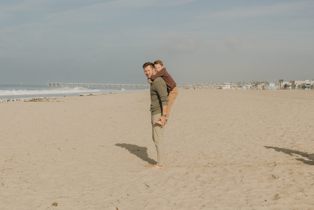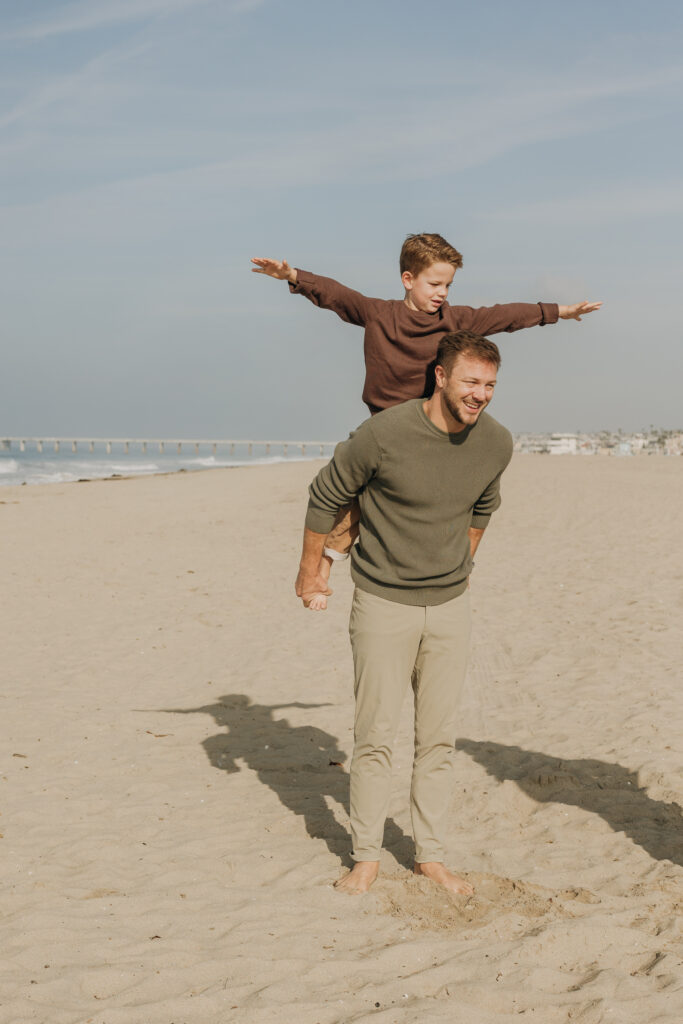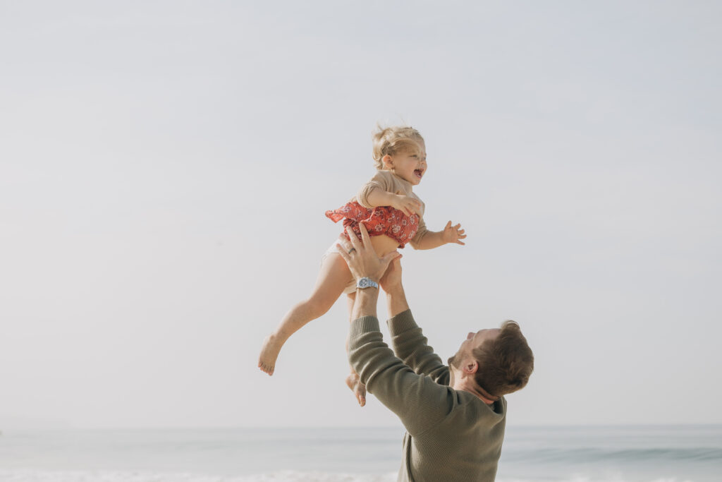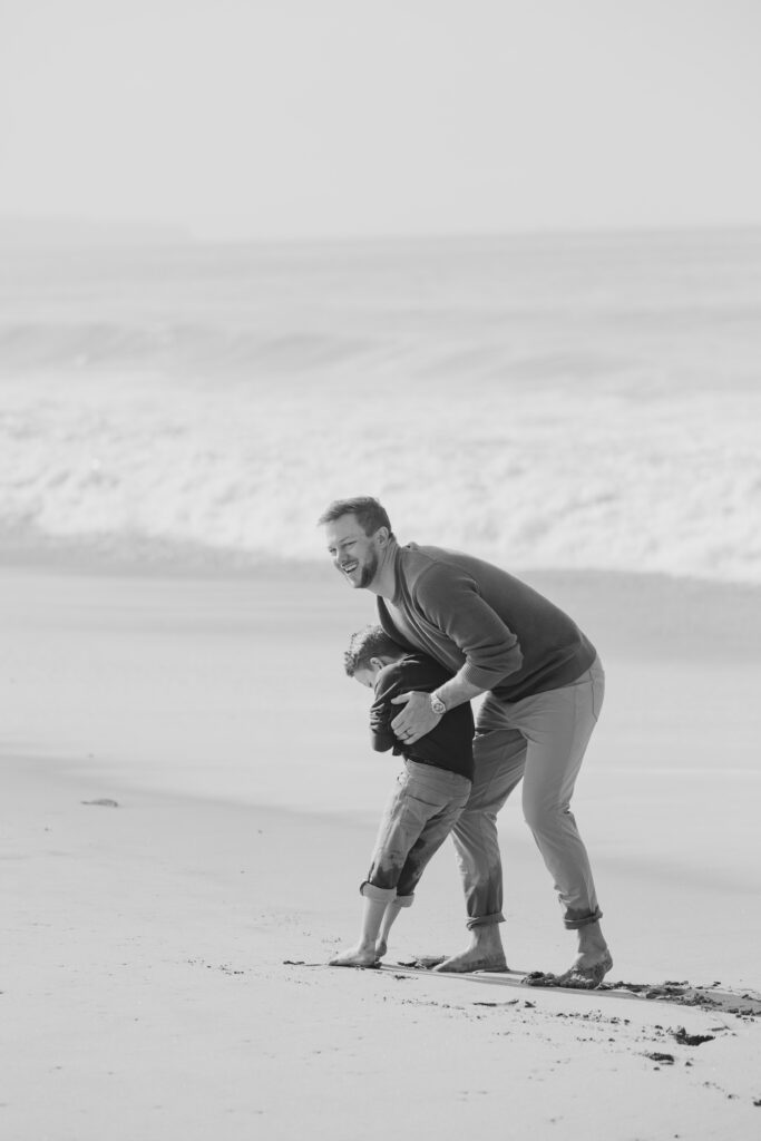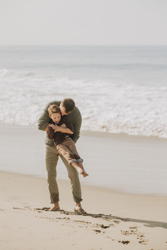 By the water’s edge, dad swung his son through the air while mom and daughter played nearby, embracing the carefree spirit of a coastal family session.