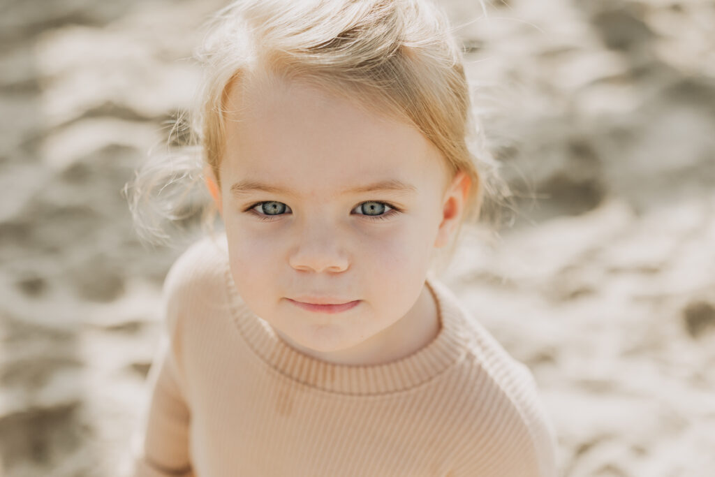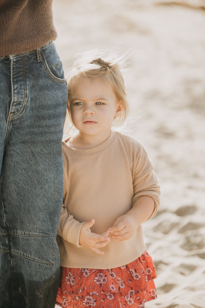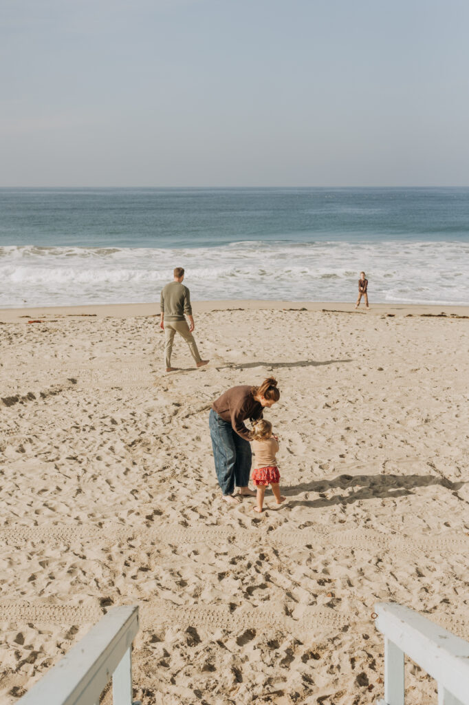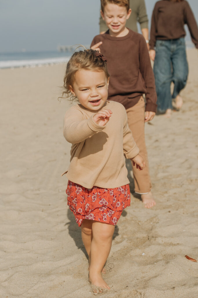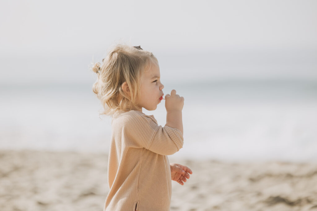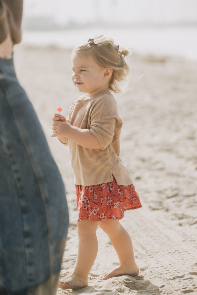 The toddler girl wandered the sand with beachy waves in her hair and a lollipop in hand, creating candid Hermosa Beach family photos.