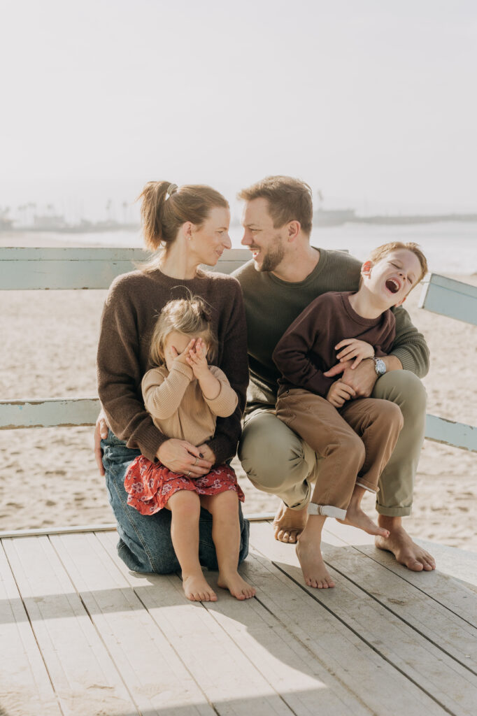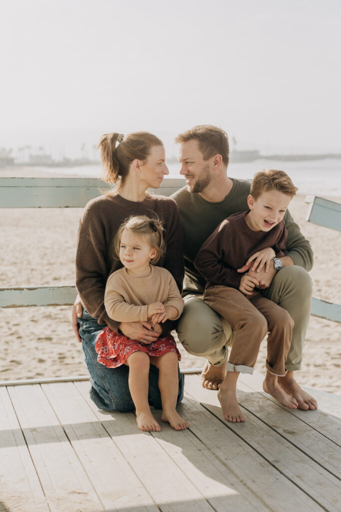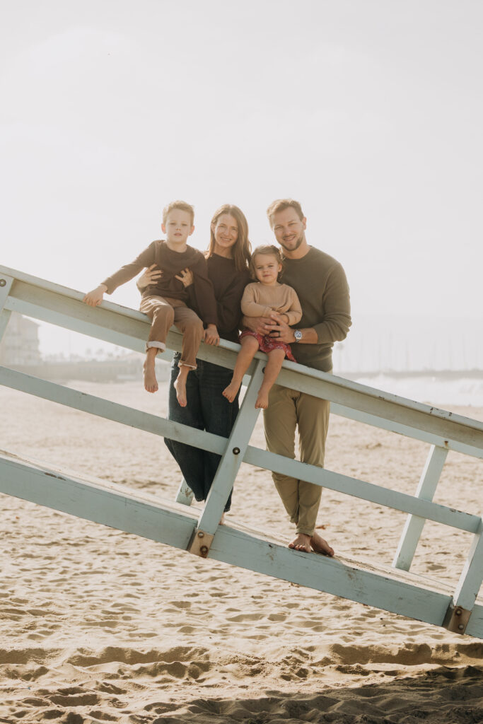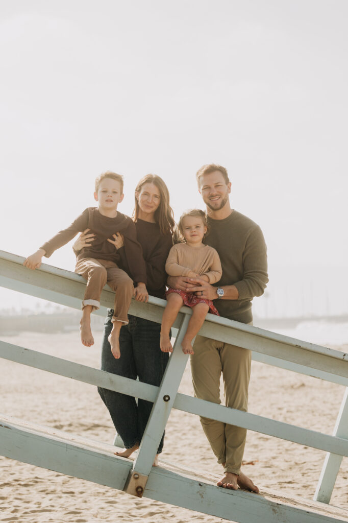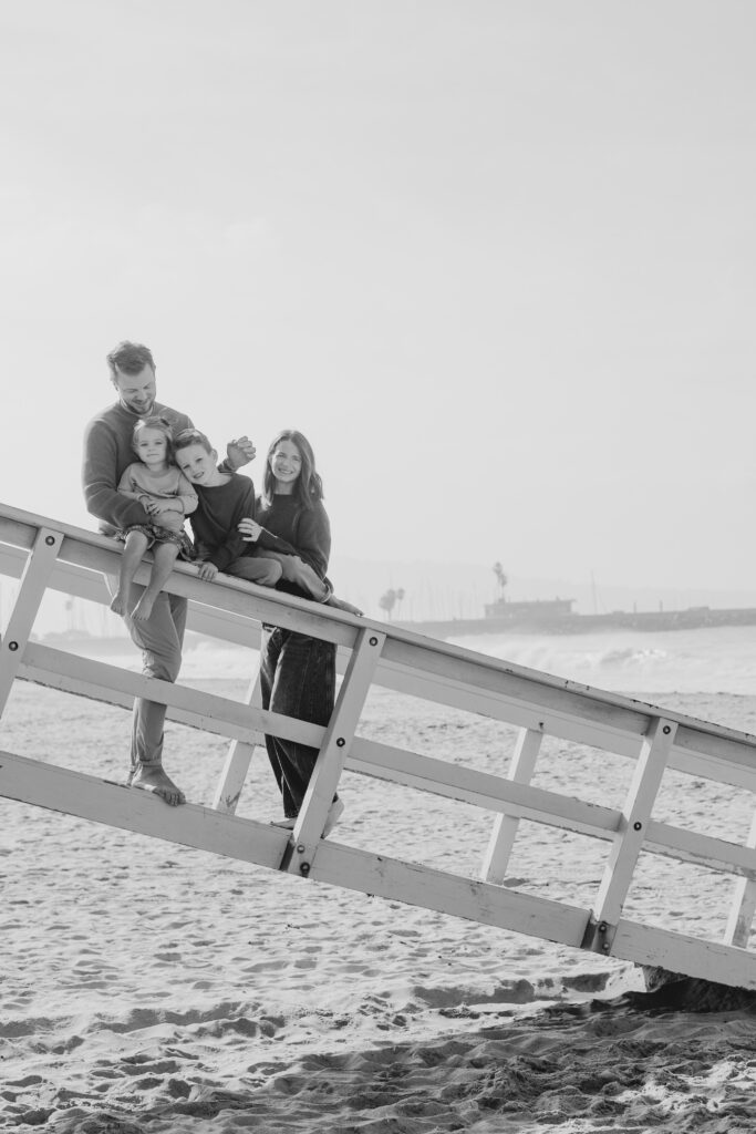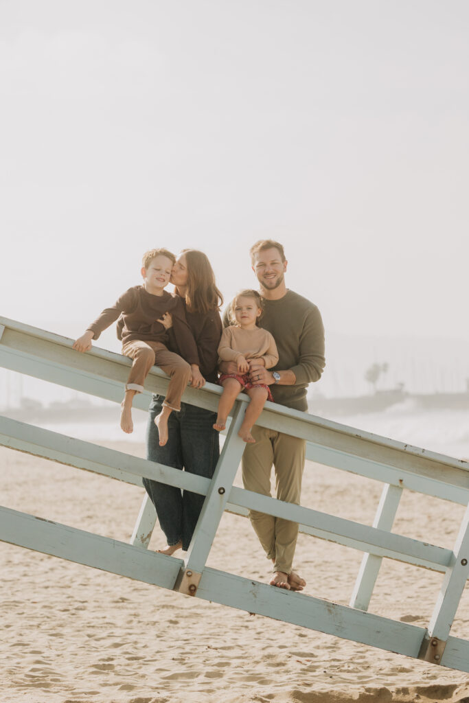 Snuggled together while sitting on the tower, the family shared a quiet moment during their Hermosa Beach family session.
