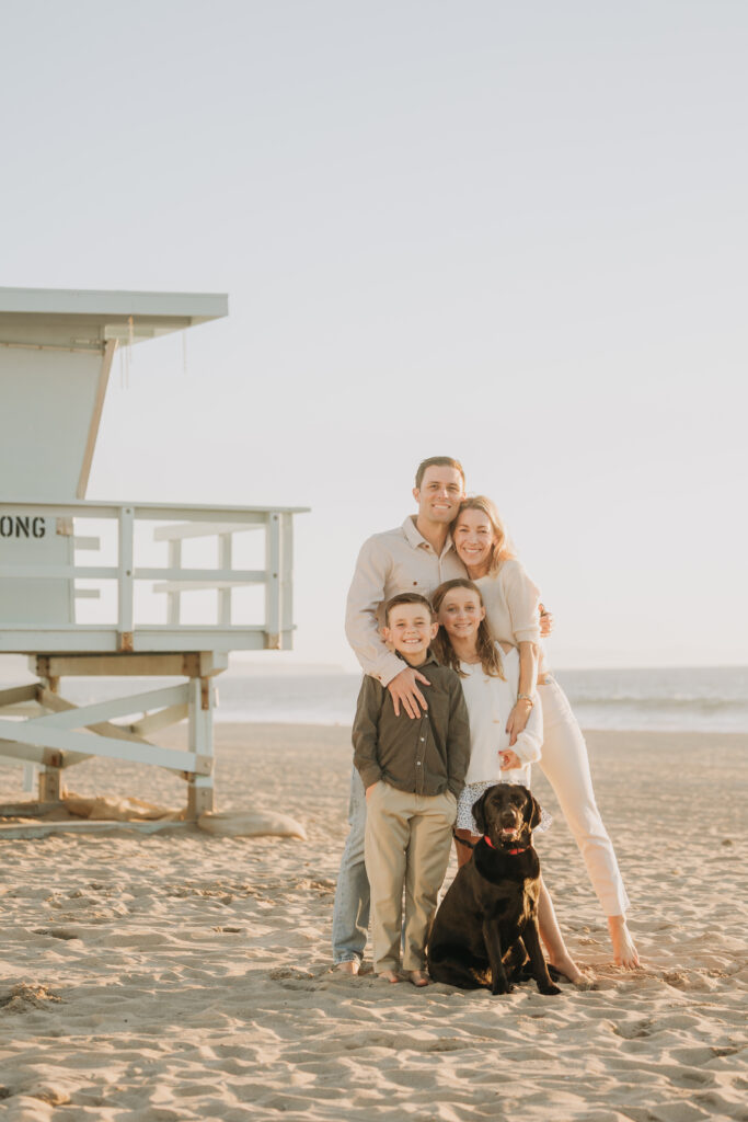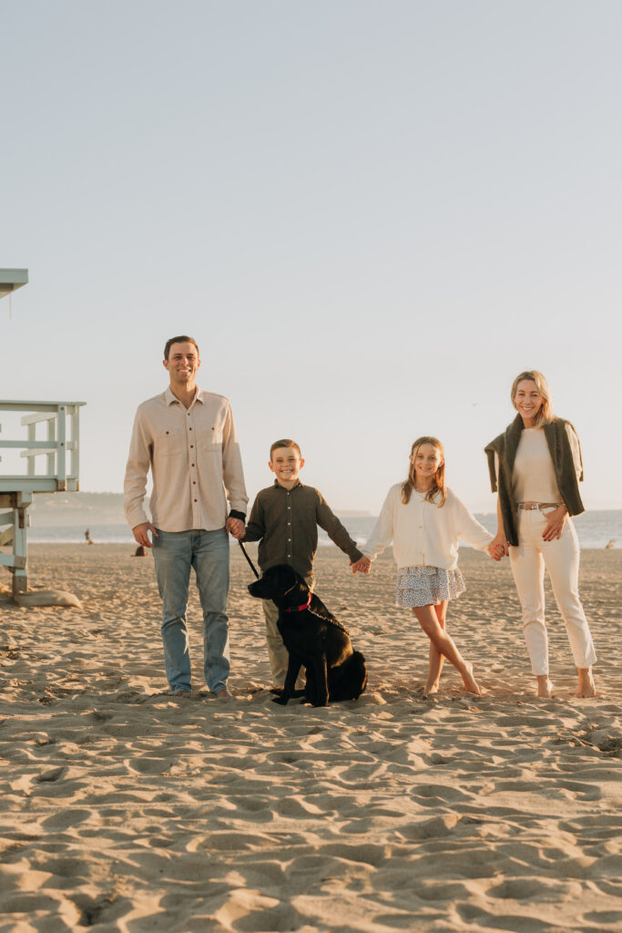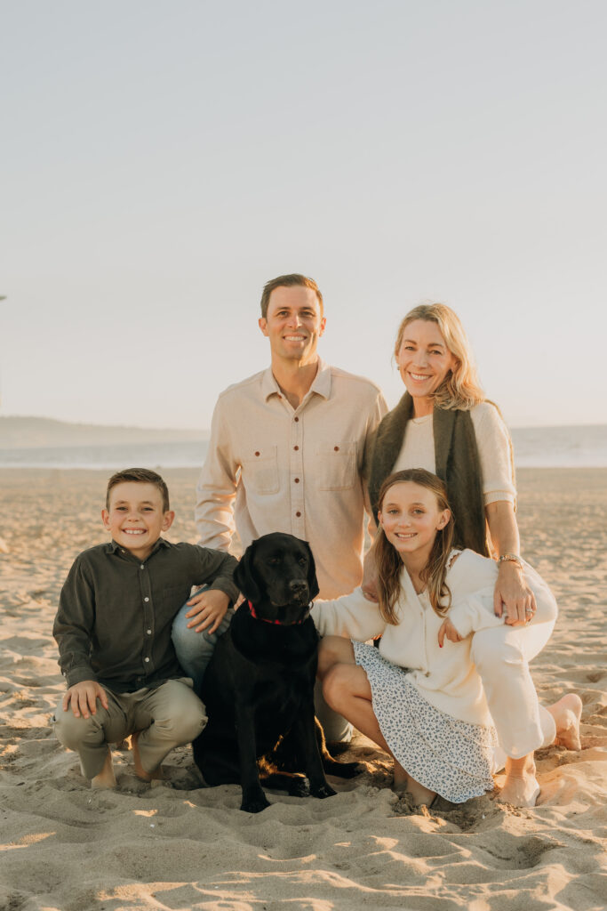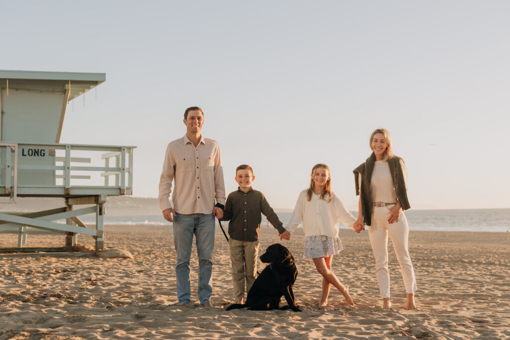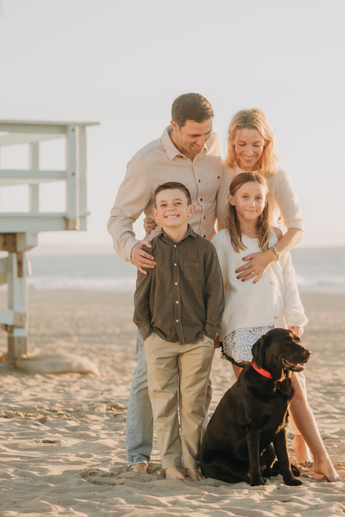 A joyful family and their dog gathered for golden hour beach family photos in Manhattan Beach, California.
