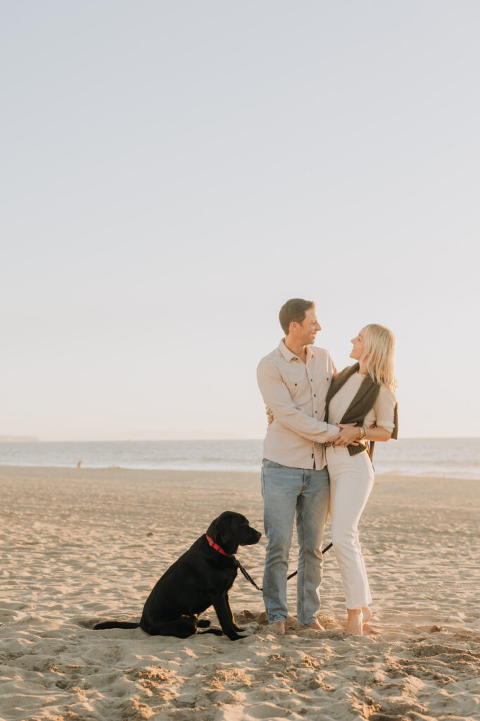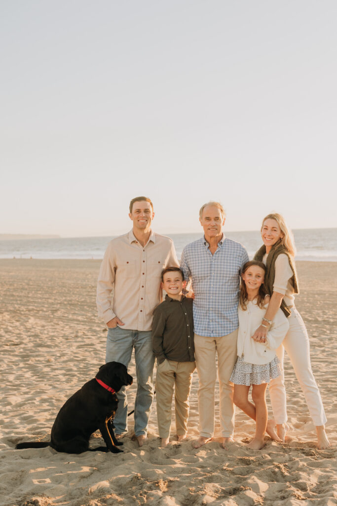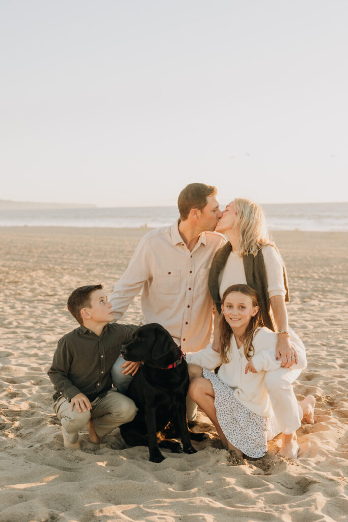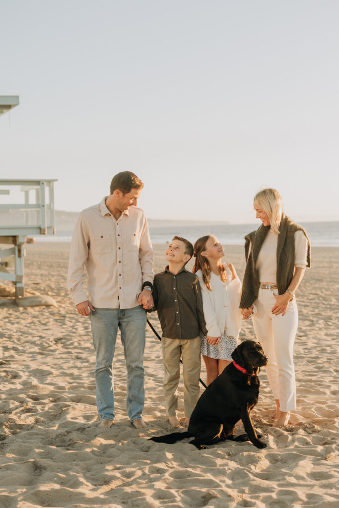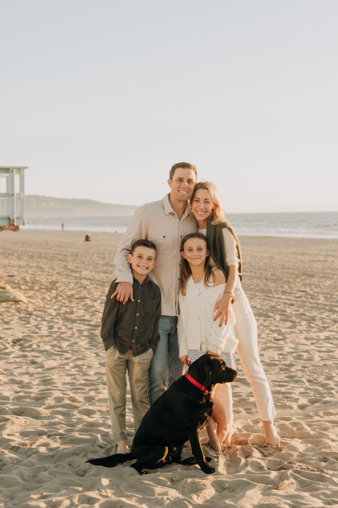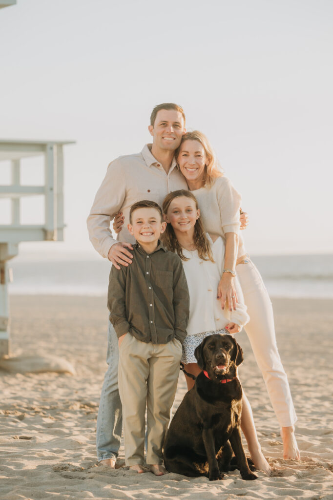 A joyful family and their dog gathered for golden hour beach family photos in Manhattan Beach, California.