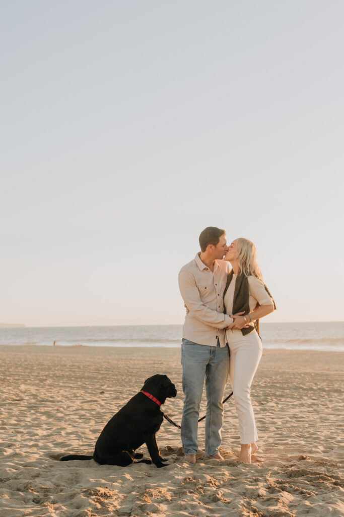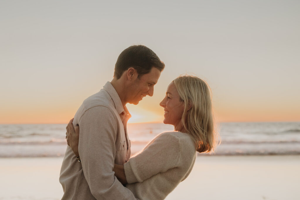 A quiet kiss between the parents unfolded as the sun dipped lower, creating timeless coastal couple portraits.