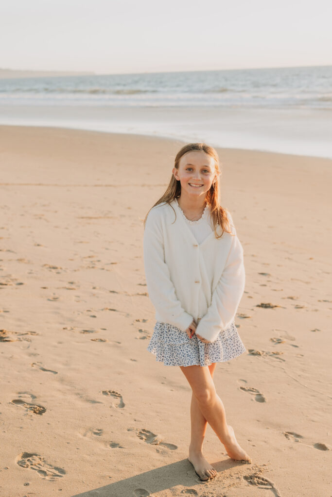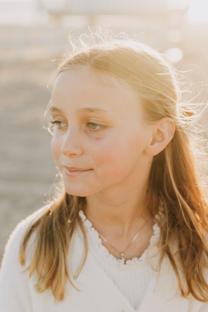 Bathed in warm sunset light, the daughter’s golden hour portrait reflected the softness of natural beach family photos.