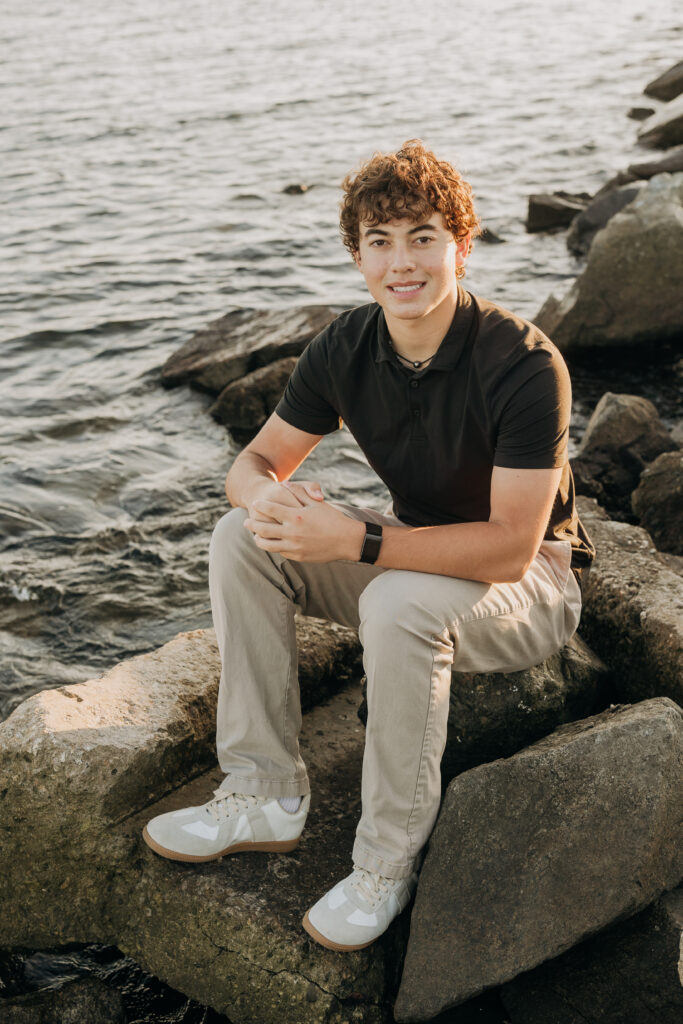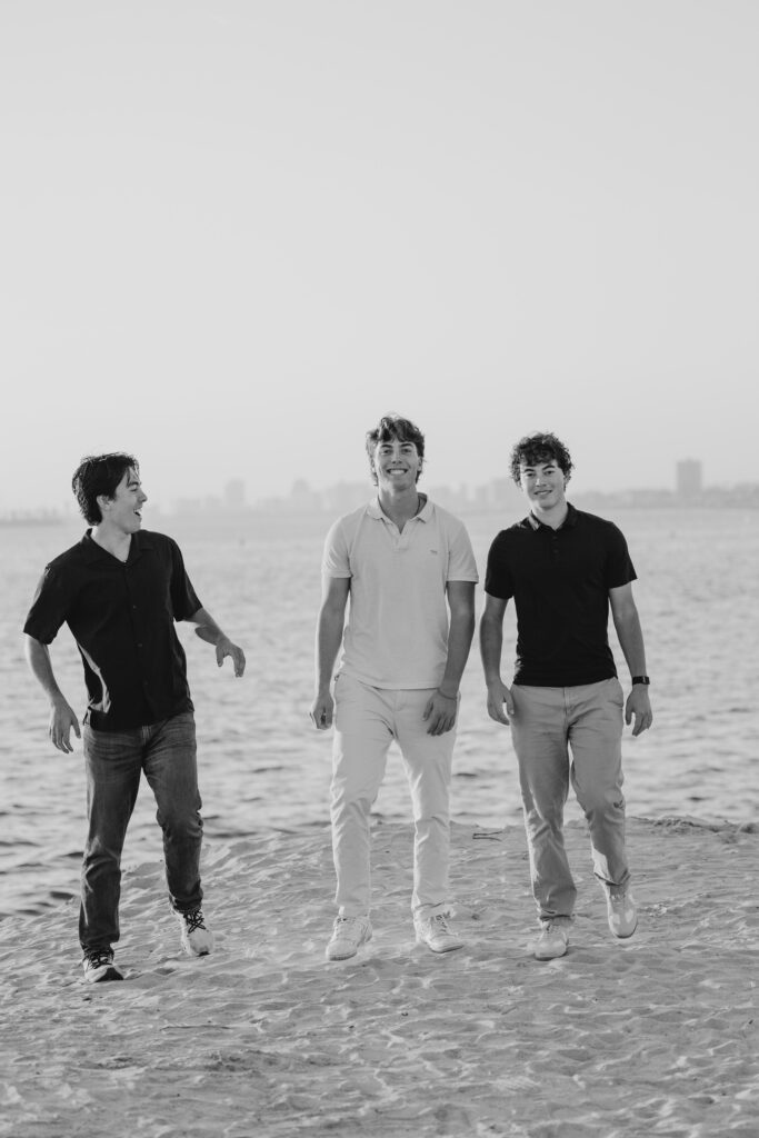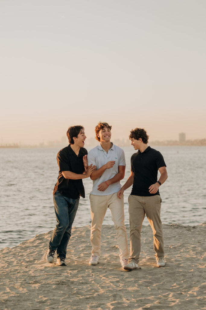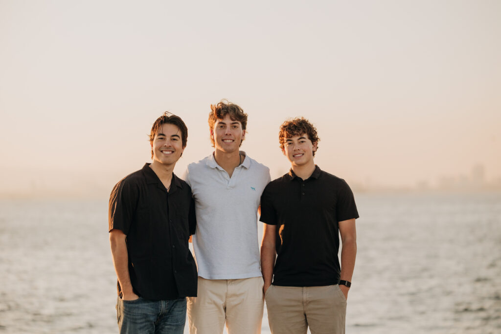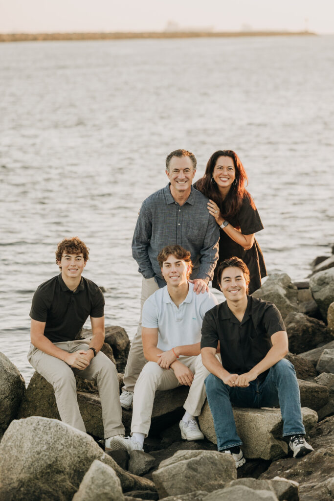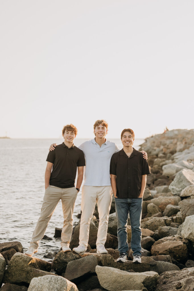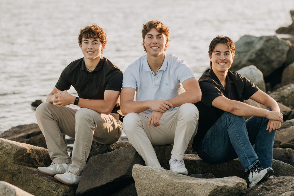 The three brothers sat together on the rocks by the water, a relaxed moment captured during their Long Beach beach family photos.