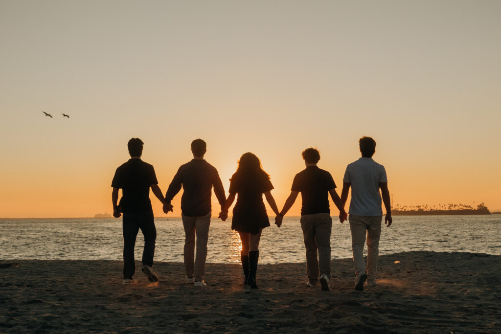 A family of five gathered for elevated Long Beach Peninsula family photos, celebrating connection during their Southern California coastal photo session.