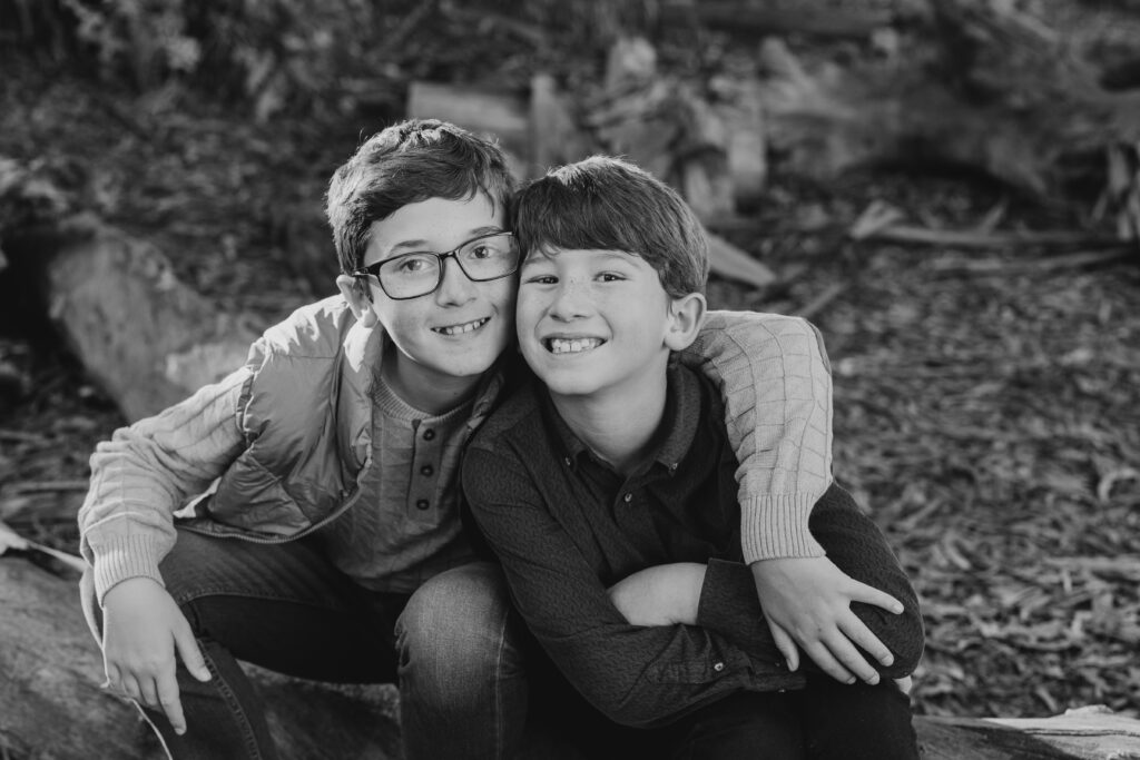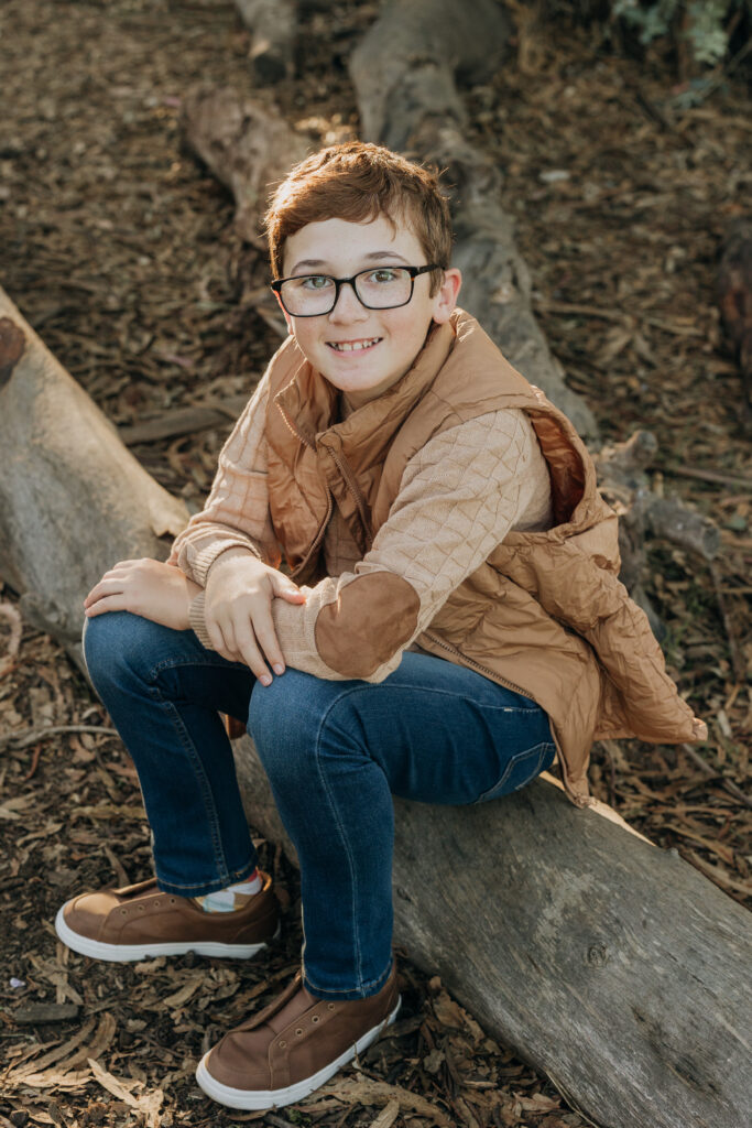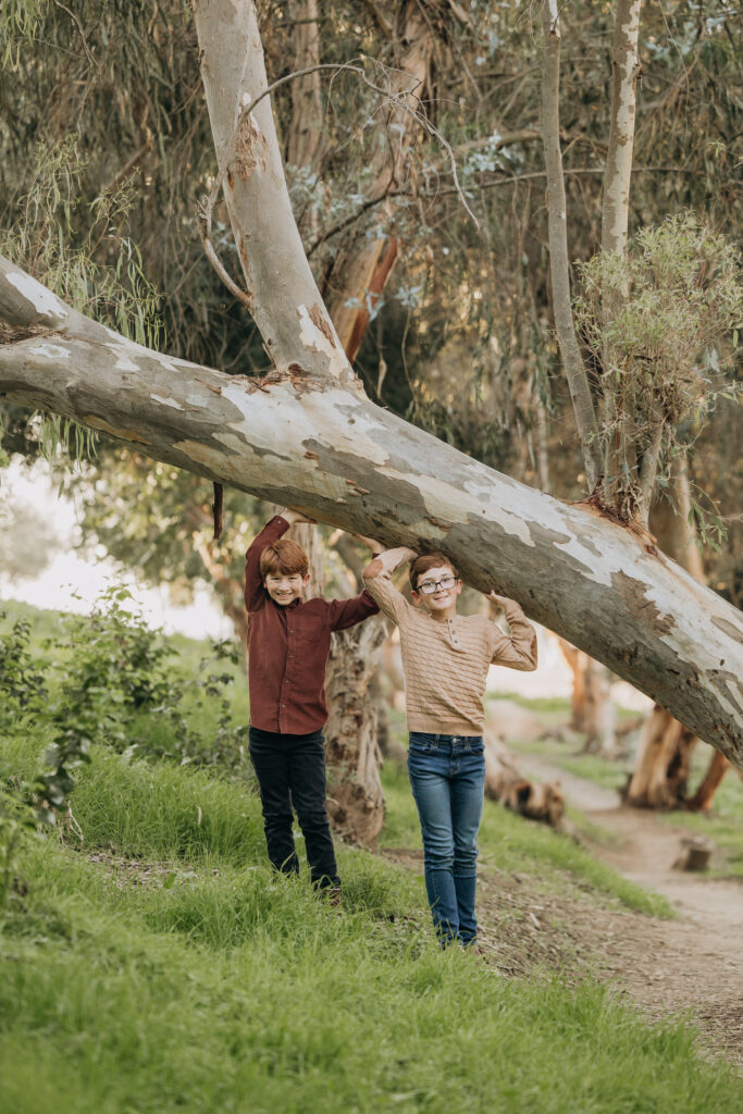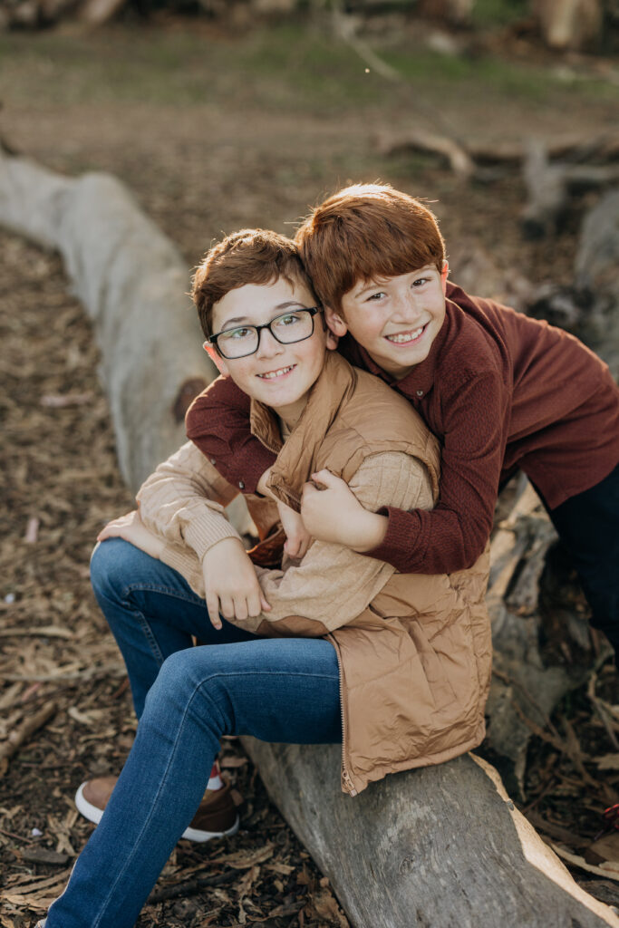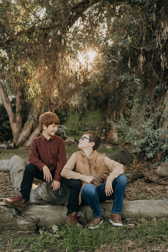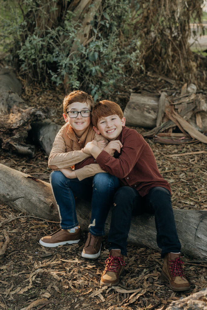 The two middle-school brothers sat on some eucalyptus tree trunks- this is what a natural Gum Grove Park family session looks like from the start.