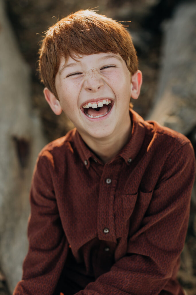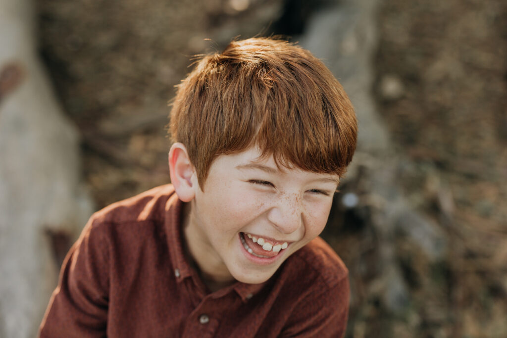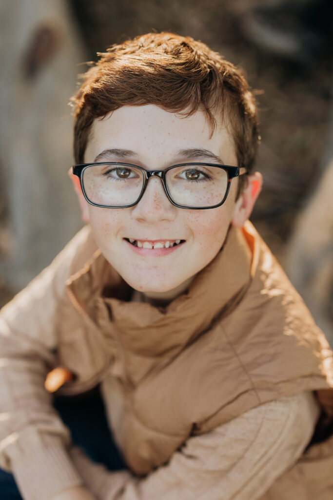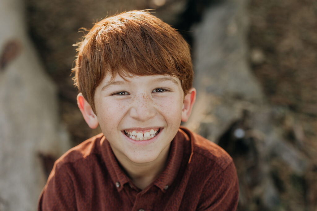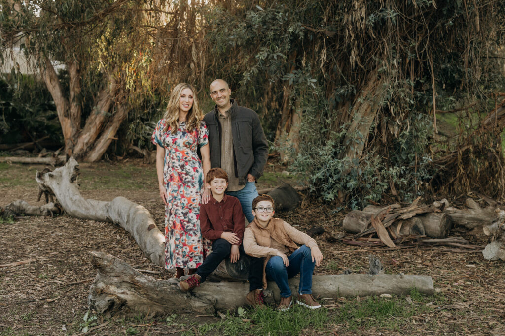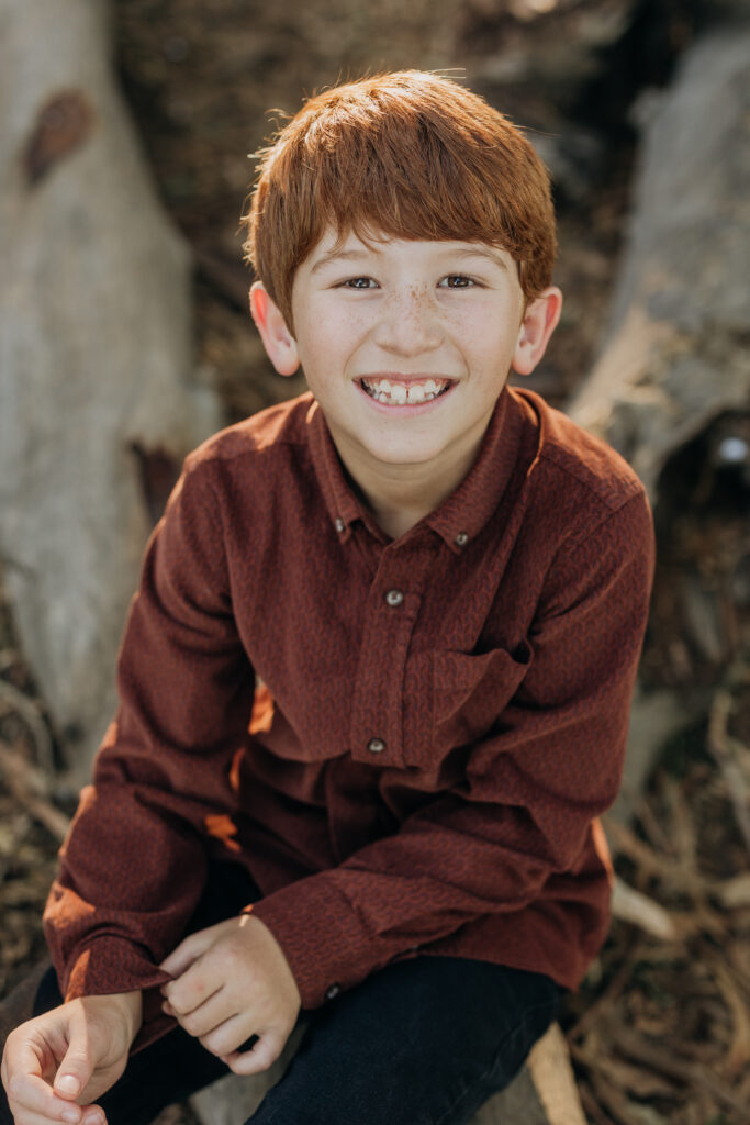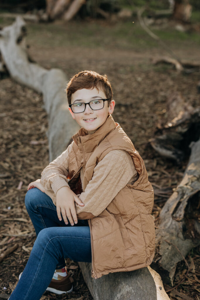 The two middle-school brothers sat on some eucalyptus tree trunks- this is what a natural Gum Grove Park family session looks like from the start.