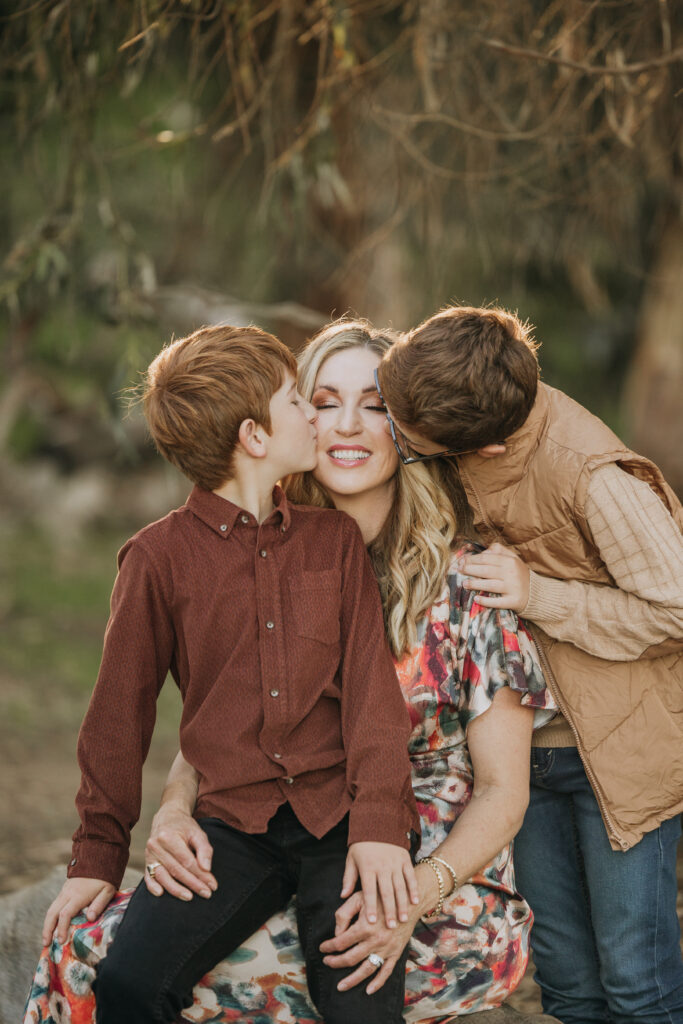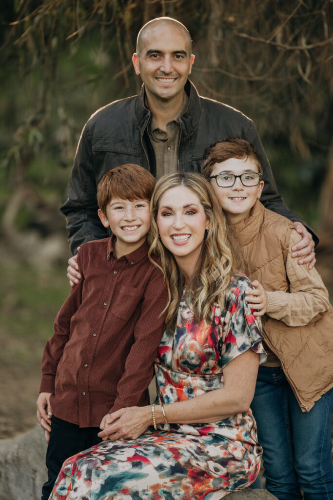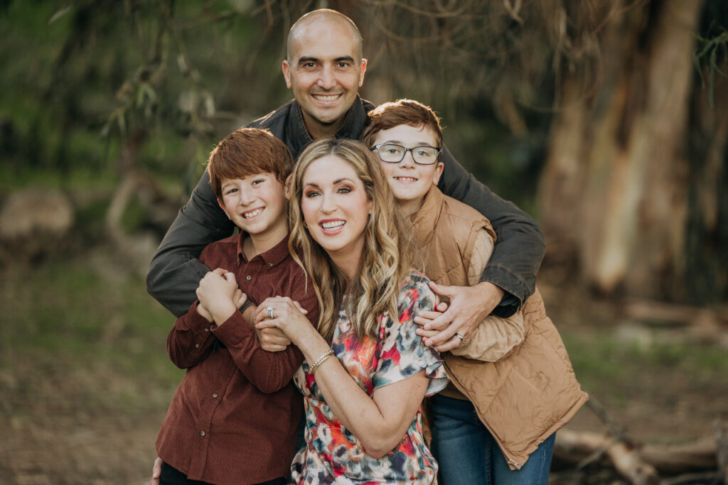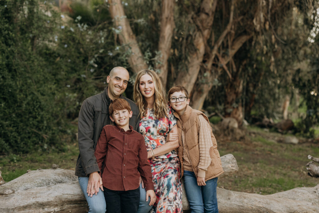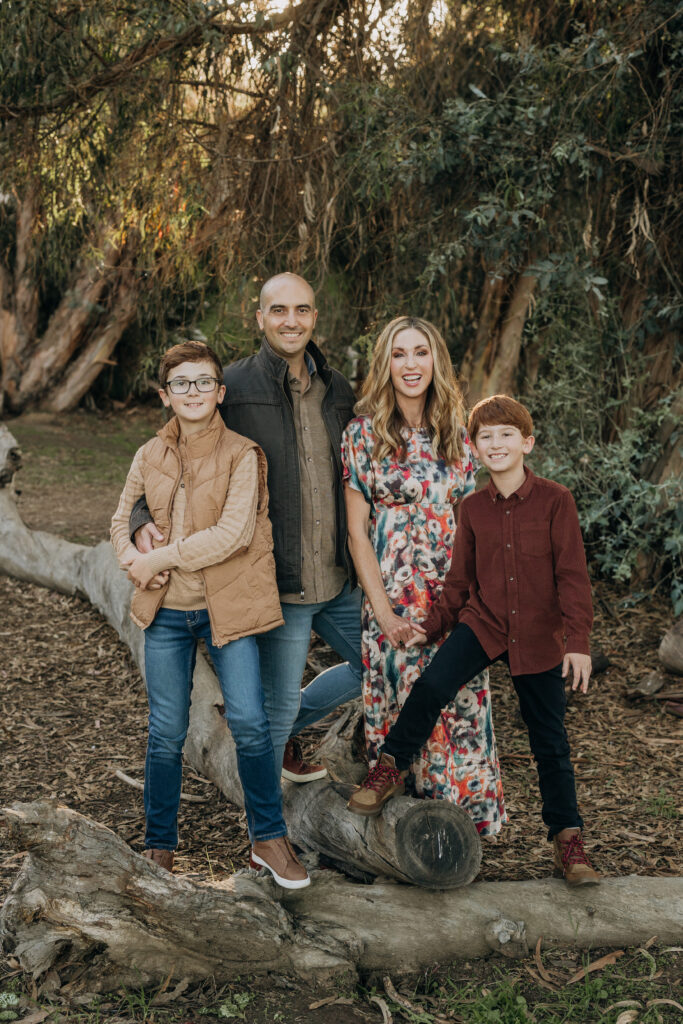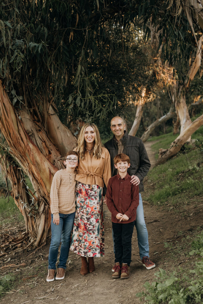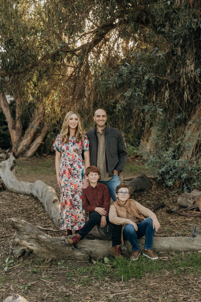 The whole family together in the woodland setting of Gum Grove Park. Eucalyptus trees, natural light, and one of the most beautiful backdrops for family portraits in Orange County.
