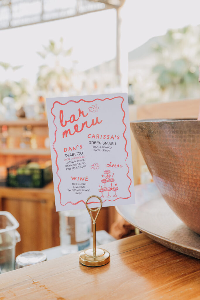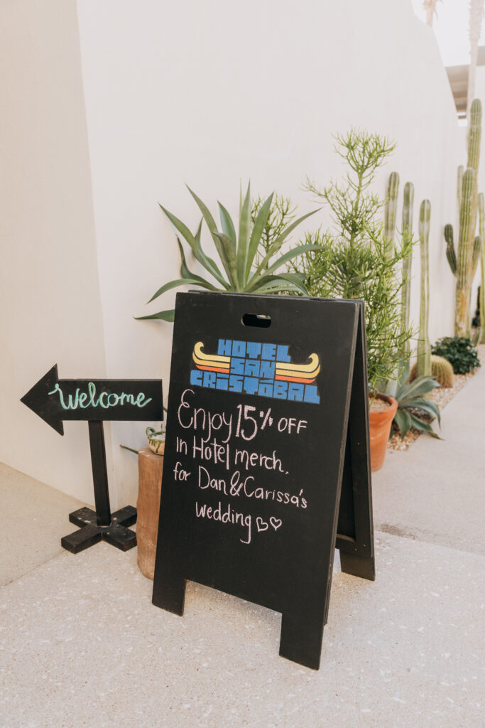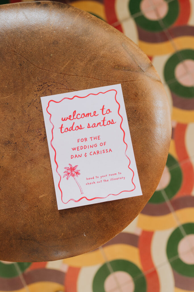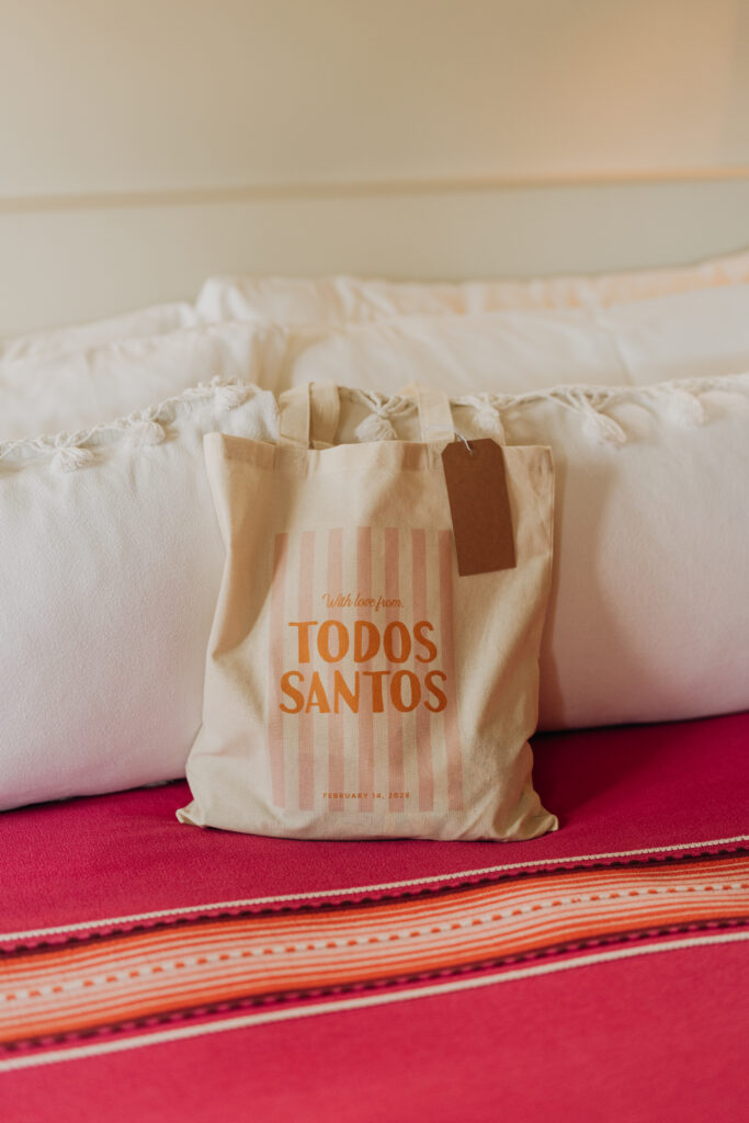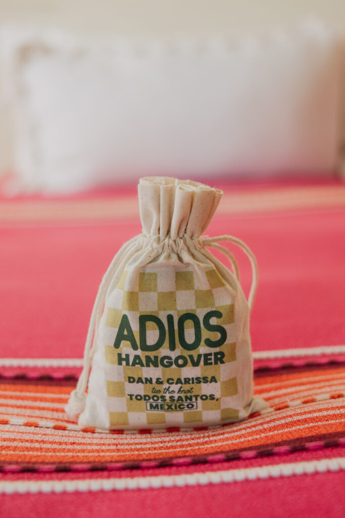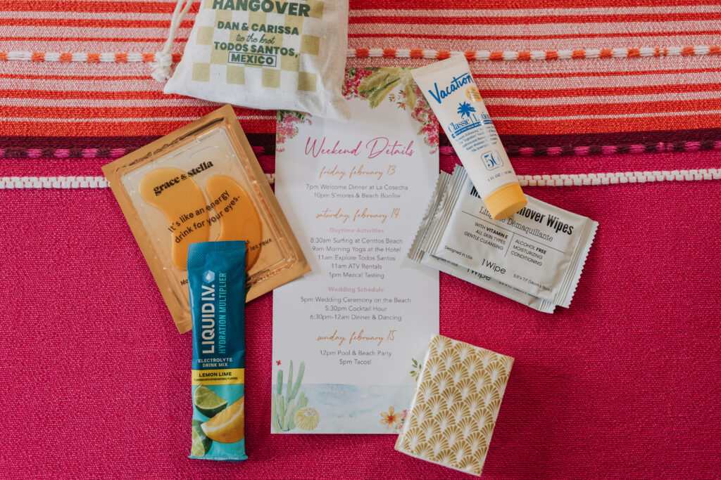 A thoughtful welcome awaits guests at this luxury destination wedding in Todos Santos, Mexico: morning kits stocked with hangover remedy, sunscreen, and under-eye patches.