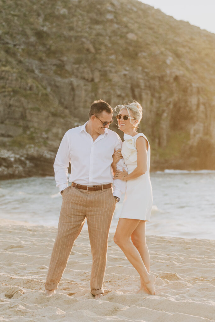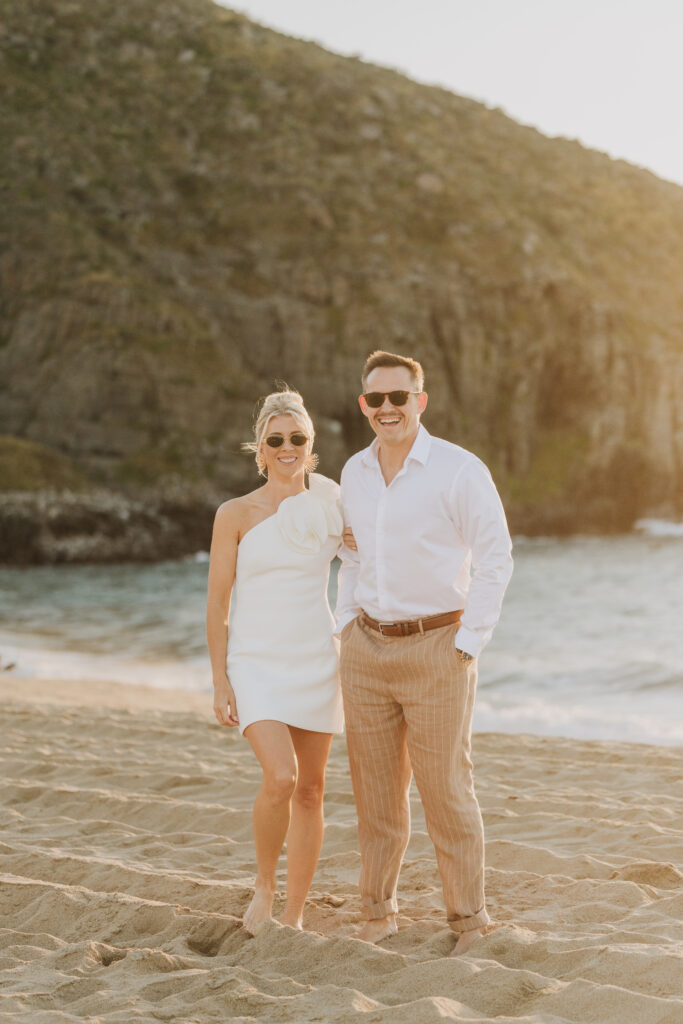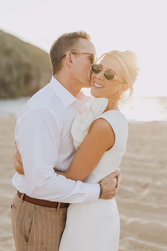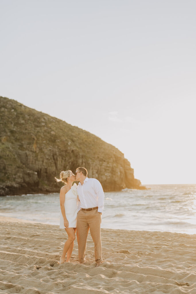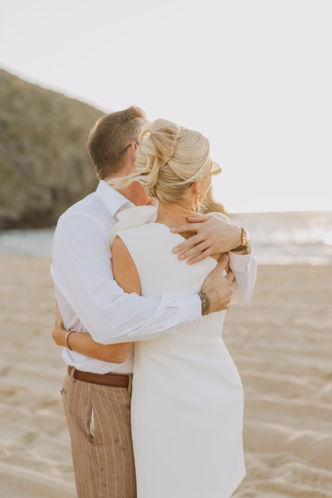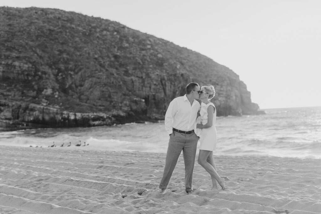 Carissa and Dan on the beach at Punta Lobos before the rehearsal dinner  share a sweet candid moment during their Todos Santos destination wedding.