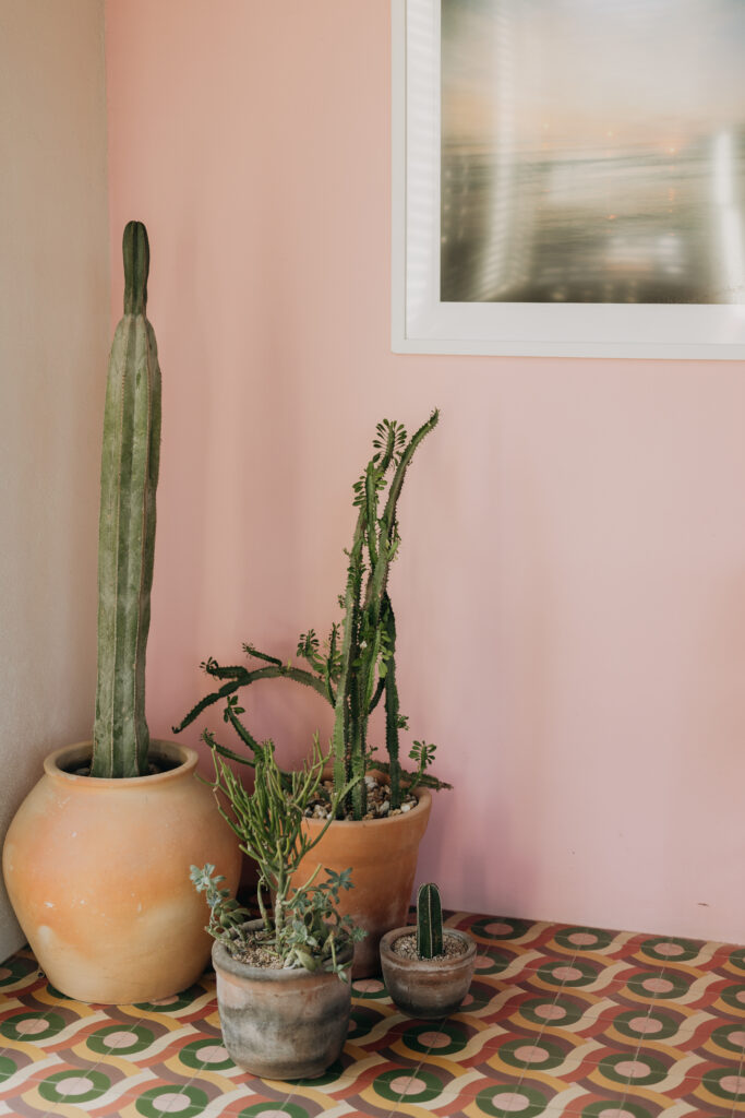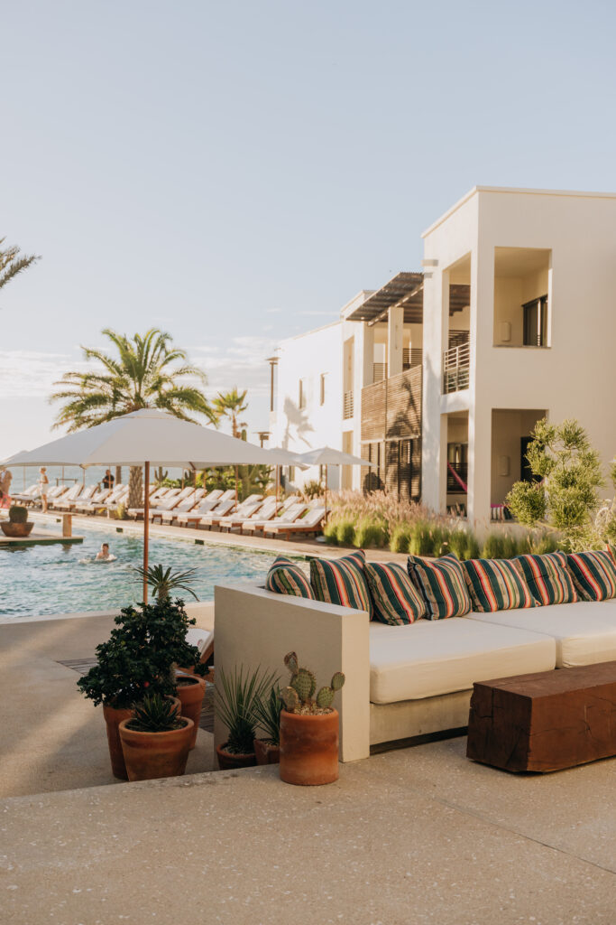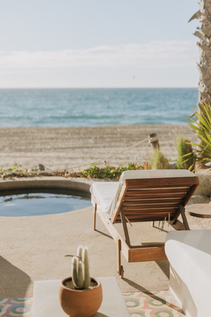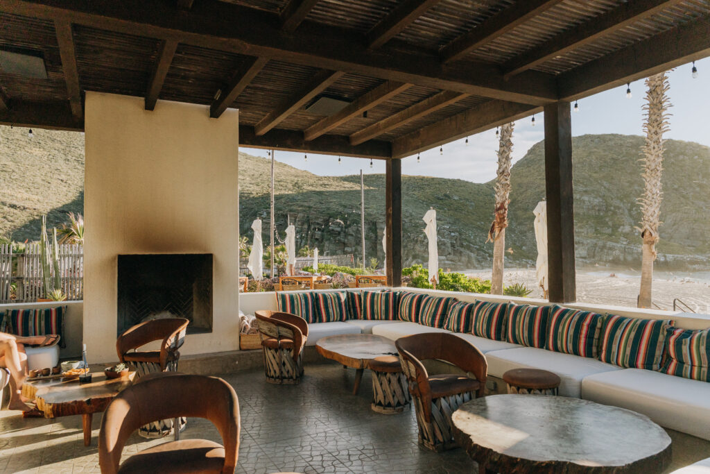 The bohemian interiors of Hotel San Cristóbal set the tone: 1970s-inspired design, handmade Mexican furniture, vibrant tilework, and sweeping views of the ocean and mountains.