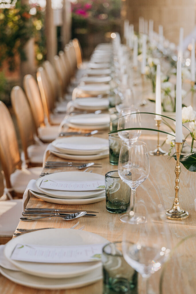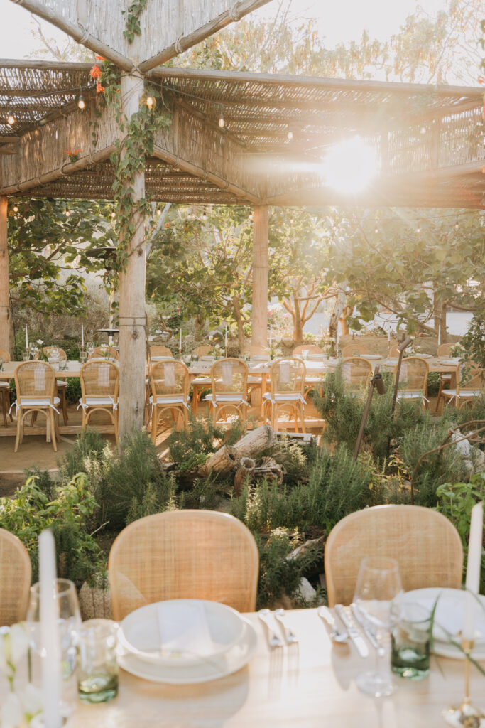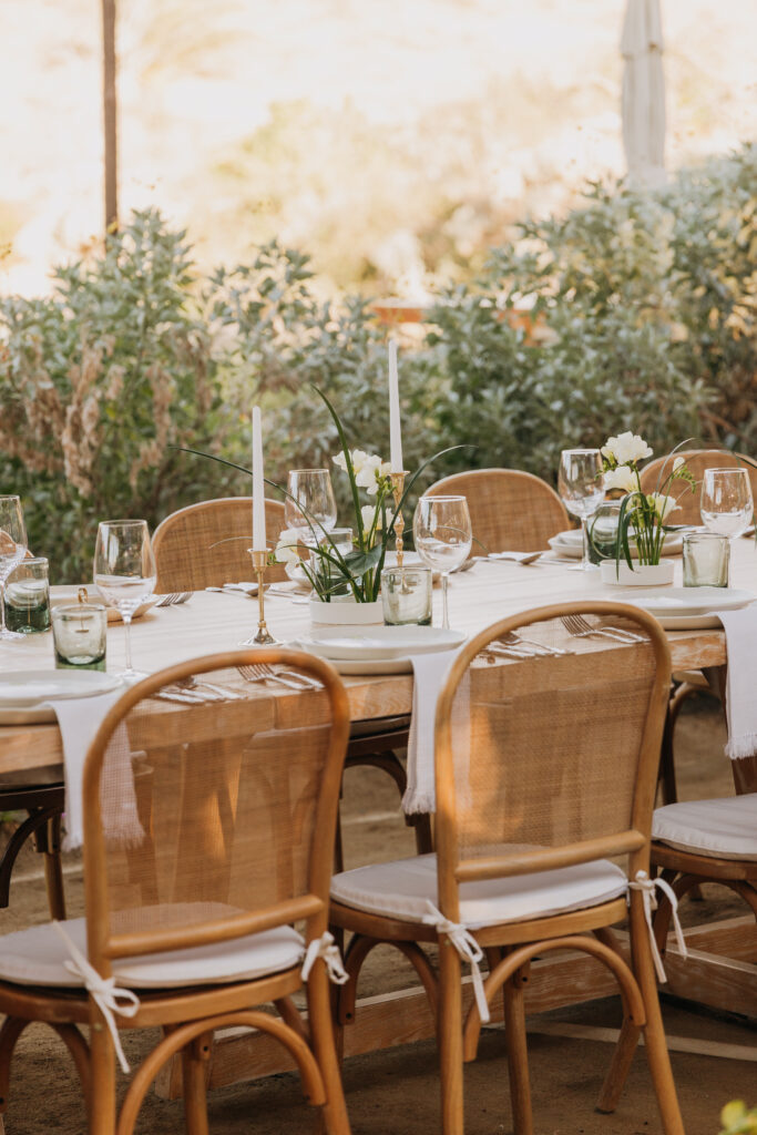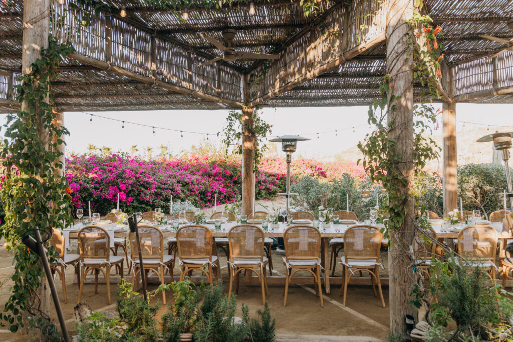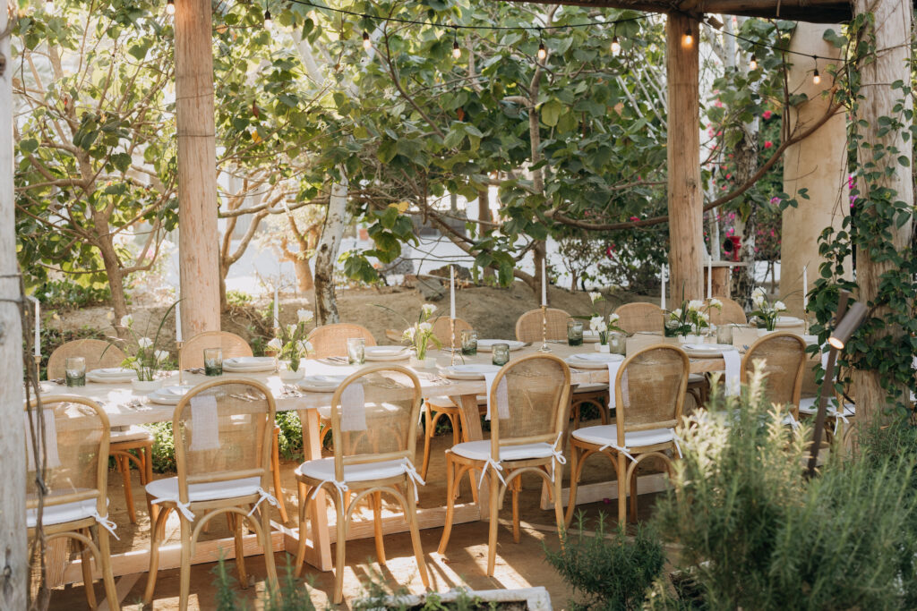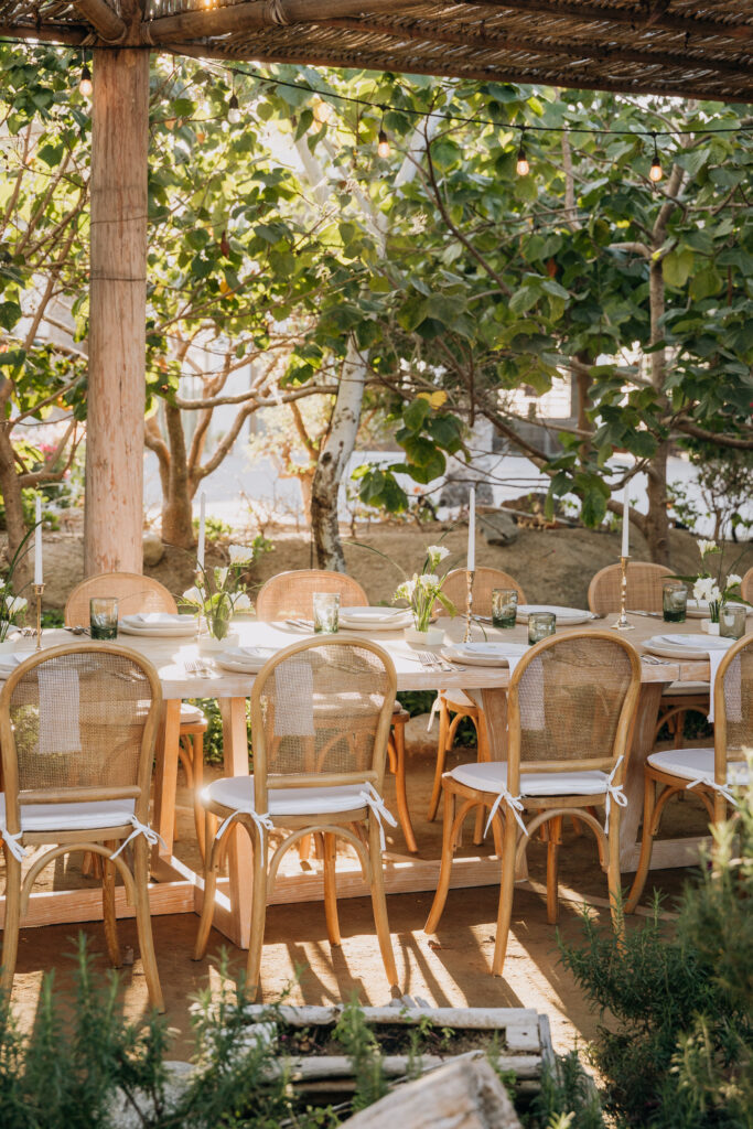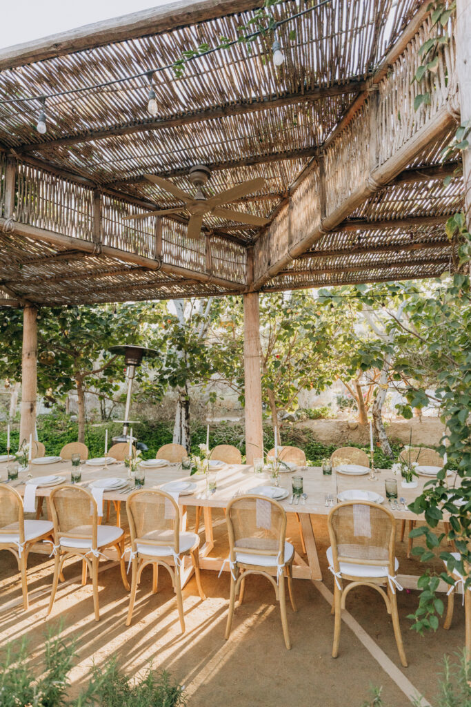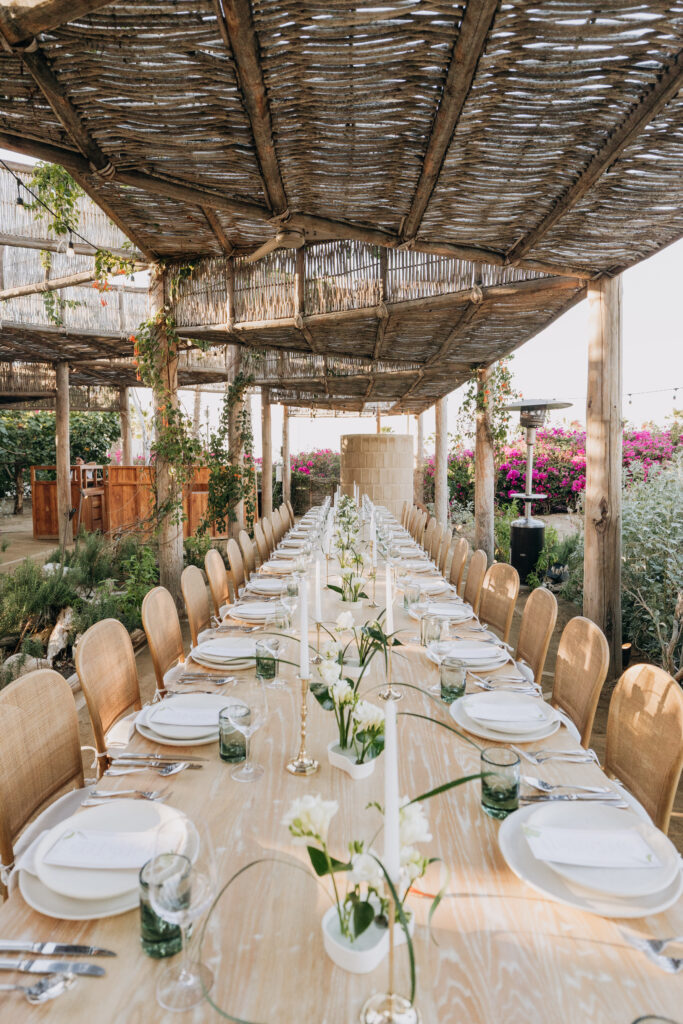 Bamboo chairs, white linen, and an earthy green-and-ivory tablescape made the rehearsal dinner design so special at Hotel San Cristóbal, Todos Santos.