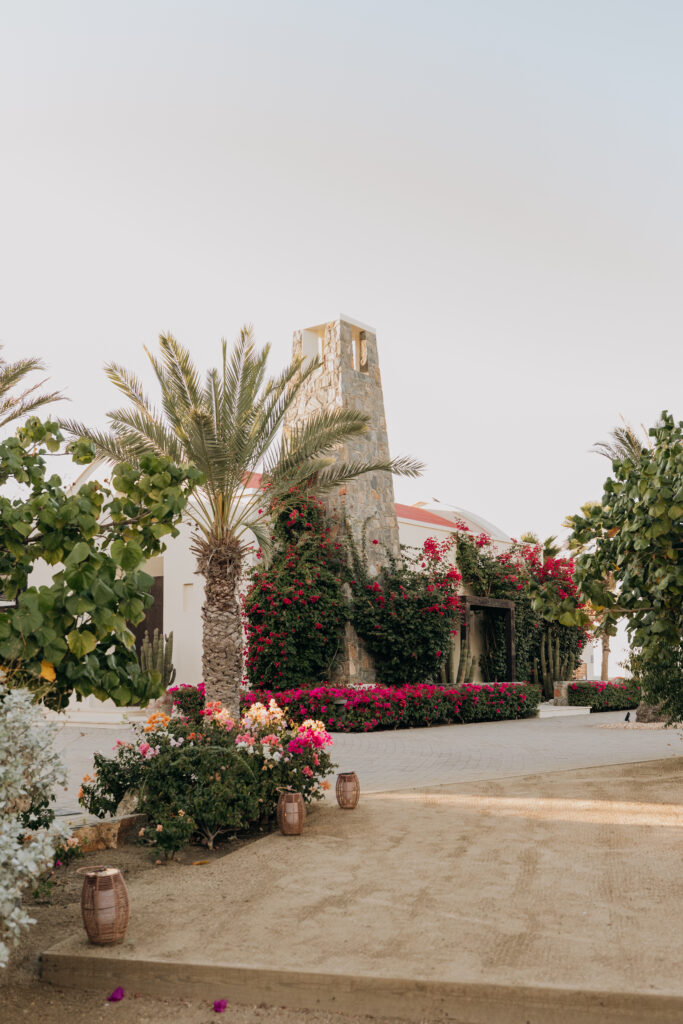 Golden hour hits the entrance, cocktails, and pool deck at Hotel San Cristóbal, illuminating the place as one of the most breathtaking wedding venues in Mexico.